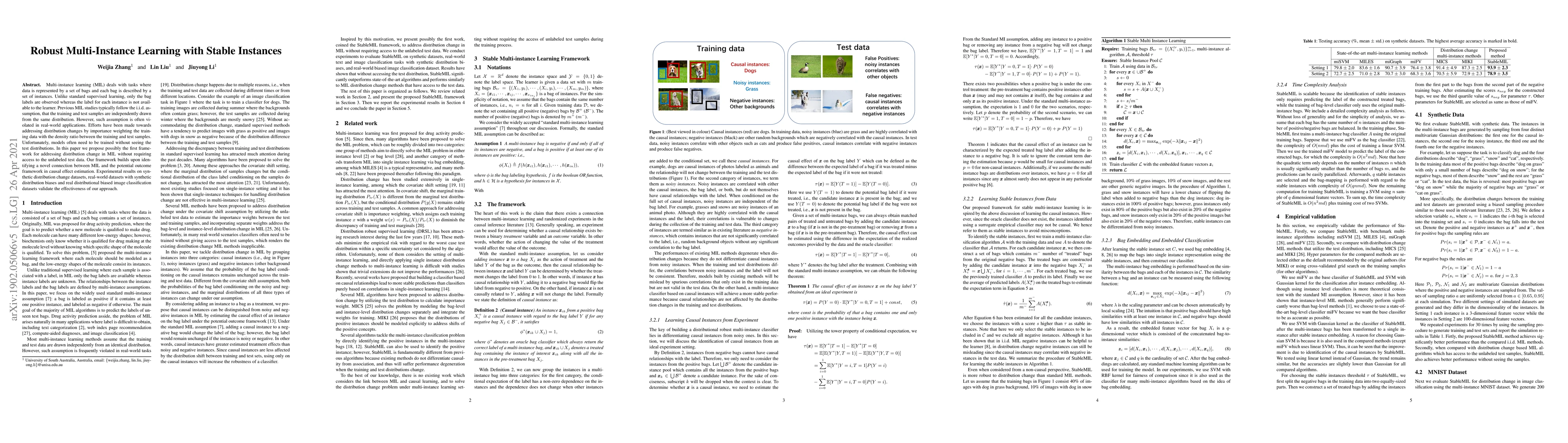 Multi-instance learning (MIL) deals with tasks where data is represented by a set of bags and each bag is described by a set of instances. Unlike standard supervised learning, only the bag labels are observed whereas the label for each instance is not available to the learner. Previous MIL studies typically follow the i.i.d. assumption, that the training and test samples are independently drawn from the same distribution. However, such assumption is often violated in real-world applications. Efforts have been made towards addressing distribution changes by importance weighting the training data with the density ratio between the training and test samples. Unfortunately, models often need to be trained without seeing the test distributions. In this paper we propose possibly the first framework for addressing distribution change in MIL without requiring access to the unlabeled test data. Our framework builds upon identifying a novel connection between MIL and the potential outcome framework in causal effect estimation. Experimental results on synthetic distribution change datasets, real-world datasets with synthetic distribution biases and real distributional biased image classification datasets validate the effectiveness of our approach.