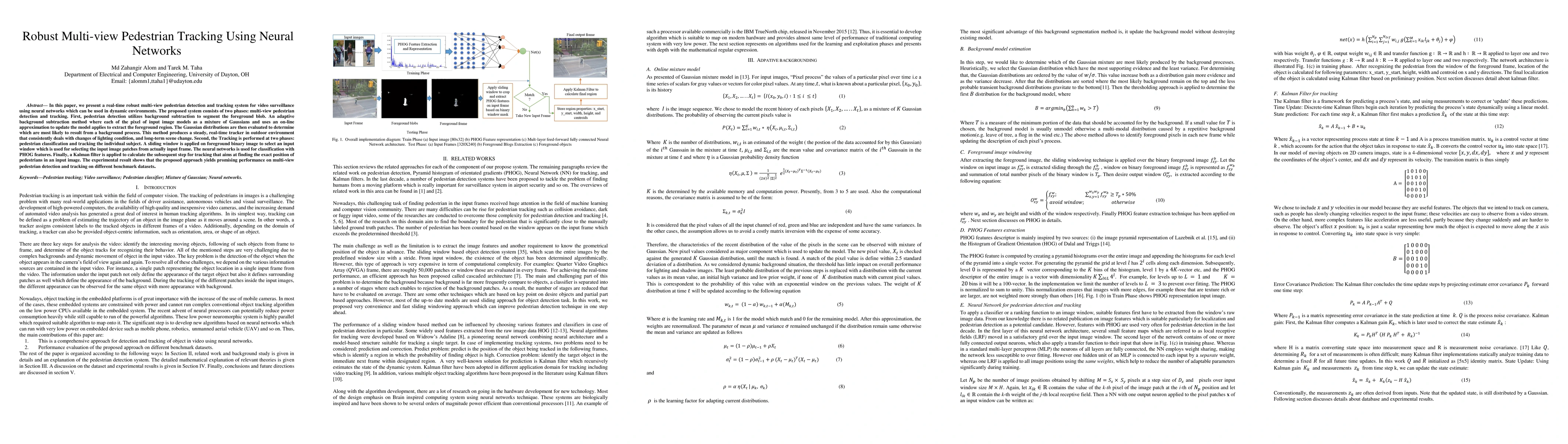 In this paper, we present a real-time robust multi-view pedestrian detection and tracking system for video surveillance using neural networks which can be used in dynamic environments. The proposed system consists of two phases: multi-view pedestrian detection and tracking. First, pedestrian detection utilizes background subtraction to segment the foreground blob. An adaptive background subtraction method where each of the pixel of input image models as a mixture of Gaussians and uses an on-line approximation to update the model applies to extract the foreground region. The Gaussian distributions are then evaluated to determine which are most likely to result from a background process. This method produces a steady, real-time tracker in outdoor environment that consistently deals with changes of lighting condition, and long-term scene change. Second, the Tracking is performed at two phases: pedestrian classification and tracking the individual subject. A sliding window is applied on foreground binary image to select an input window which is used for selecting the input image patches from actually input frame. The neural networks is used for classification with PHOG features. Finally, a Kalman filter is applied to calculate the subsequent step for tracking that aims at finding the exact position of pedestrians in an input image. The experimental result shows that the proposed approach yields promising performance on multi-view pedestrian detection and tracking on different benchmark datasets.