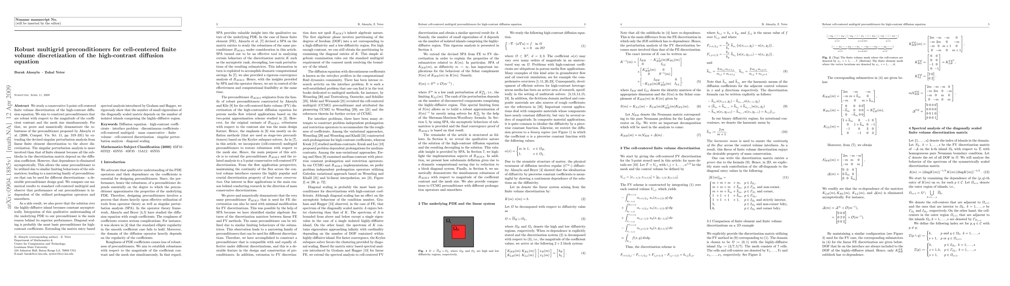 We study a conservative 5-point cell-centered finite volume discretization of the high-contrast diffusion equation. We aim to construct preconditioners that are robust with respect to the magnitude of the coefficient contrast and the mesh size simultaneously. For that, we prove and numerically demonstrate the robustness of the preconditioner proposed by Aksoylu et al. (2008, Comput. Vis. Sci. 11, pp. 319--331) by extending the devised singular perturbation analysis from linear finite element discretization to the above discretization. The singular perturbation analysis is more involved than that of finite element because all the subblocks in the discretization matrix depend on the diffusion coefficient. However, that dependence is eliminated asymptotically. This allows the same preconditioner to be utilized due to similar limiting behaviours of the submatrices; leading to a narrowing family of preconditioners that can be used for different discretizations--a desirable preconditioner design goal. We compare our numerical results to standard cell-centered multigrid and observe that performance of our preconditioner is independent of the utilized prolongation operators and smoothers. As a side result, we also prove that the solution over the highly-diffusive island becomes constant asymptotically. Integration of this qualitative understanding of the underlying PDE to our preconditioner is the main reason behind its superior performance. Diagonal scaling is probably the most basic preconditioner for high-contrast coefficients. Extending the matrix entry based spectral analysis introduced by Graham and Hagger, we rigorously show that the number of small eigenvalues of the diagonally scaled matrix depends on the number of isolated islands comprising the highly-diffusive region.