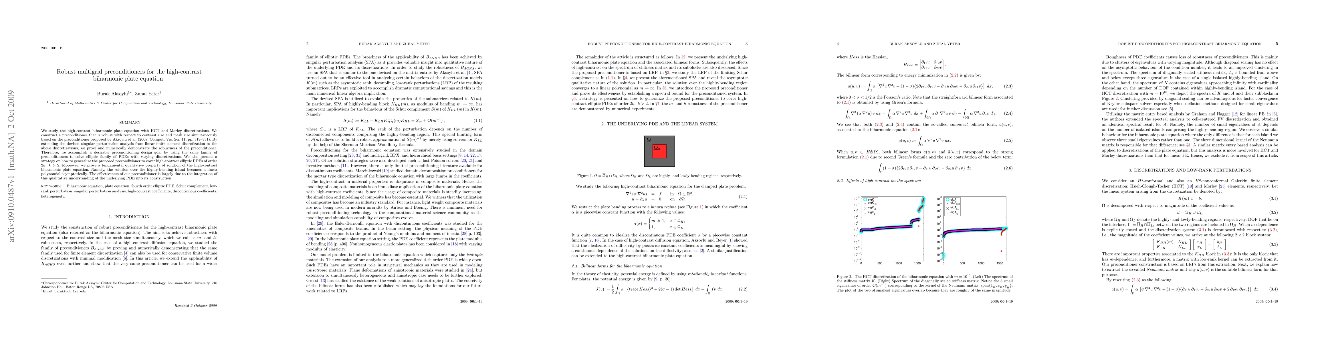 This paper develops a robust multigrid preconditioner for solving the high-contrast biharmonic plate equation, demonstrating its effectiveness with HCT and Morley discretizations. The preconditioner is shown to be robust against varying contrast and mesh sizes, and its design leverages a qualitative understanding of the PDE's solution behavior.