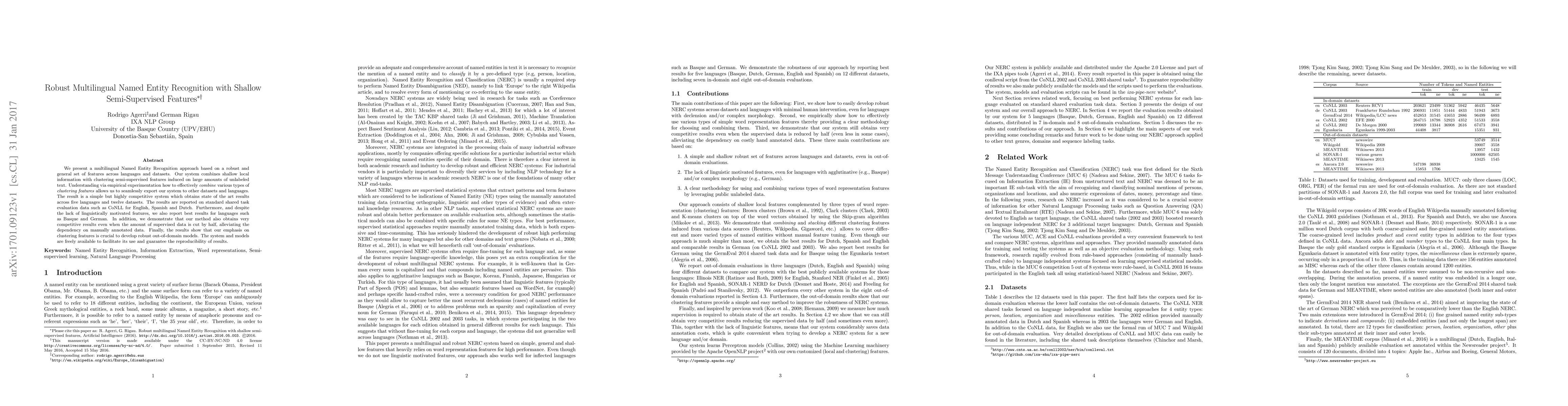 This paper proposes a multilingual Named Entity Recognition system that leverages shallow semi-supervised features and clustering techniques on unlabeled text to achieve state-of-the-art results across multiple languages and datasets, demonstrating robustness even with limited supervised data. The system's success is attributed to the effective integration of clustering features.
