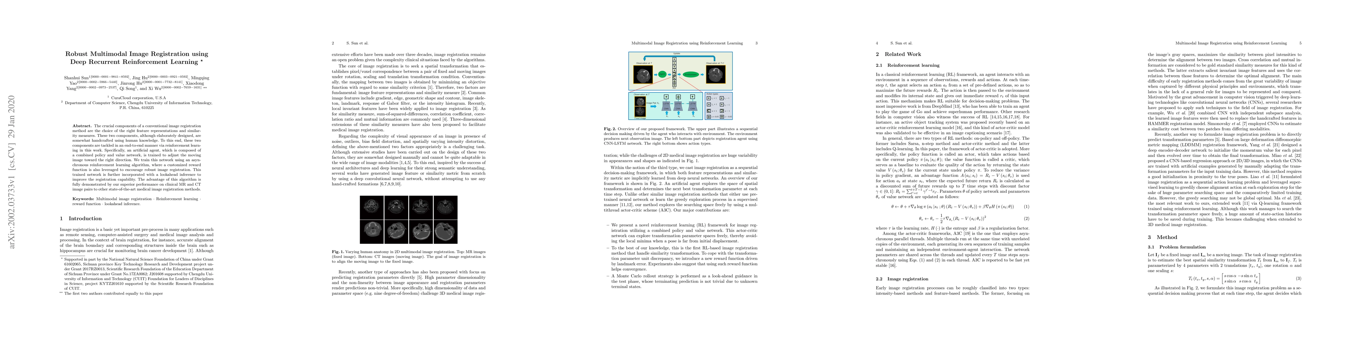 This paper proposes a deep reinforcement learning approach for multimodal image registration, training an artificial agent with a policy and value network to optimize feature representations and similarity measures automatically. The method demonstrates superior performance on clinical MR and CT images compared to other methods.