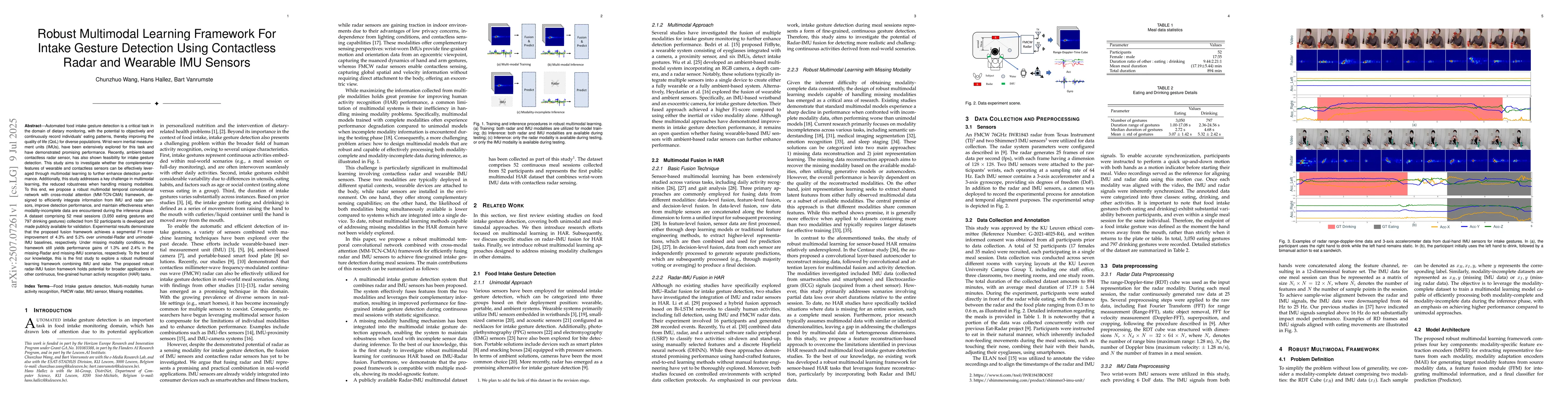 Automated food intake gesture detection plays a vital role in dietary monitoring, enabling objective and continuous tracking of eating behaviors to support better health outcomes. Wrist-worn inertial measurement units (IMUs) have been widely used for this task with promising results. More recently, contactless radar sensors have also shown potential. This study explores whether combining wearable and contactless sensing modalities through multimodal learning can further improve detection performance. We also address a major challenge in multimodal learning: reduced robustness when one modality is missing. To this end, we propose a robust multimodal temporal convolutional network with cross-modal attention (MM-TCN-CMA), designed to integrate IMU and radar data, enhance gesture detection, and maintain performance under missing modality conditions. A new dataset comprising 52 meal sessions (3,050 eating gestures and 797 drinking gestures) from 52 participants is developed and made publicly available. Experimental results show that the proposed framework improves the segmental F1-score by 4.3% and 5.2% over unimodal Radar and IMU models, respectively. Under missing modality scenarios, the framework still achieves gains of 1.3% and 2.4% for missing radar and missing IMU inputs. This is the first study to demonstrate a robust multimodal learning framework that effectively fuses IMU and radar data for food intake gesture detection.