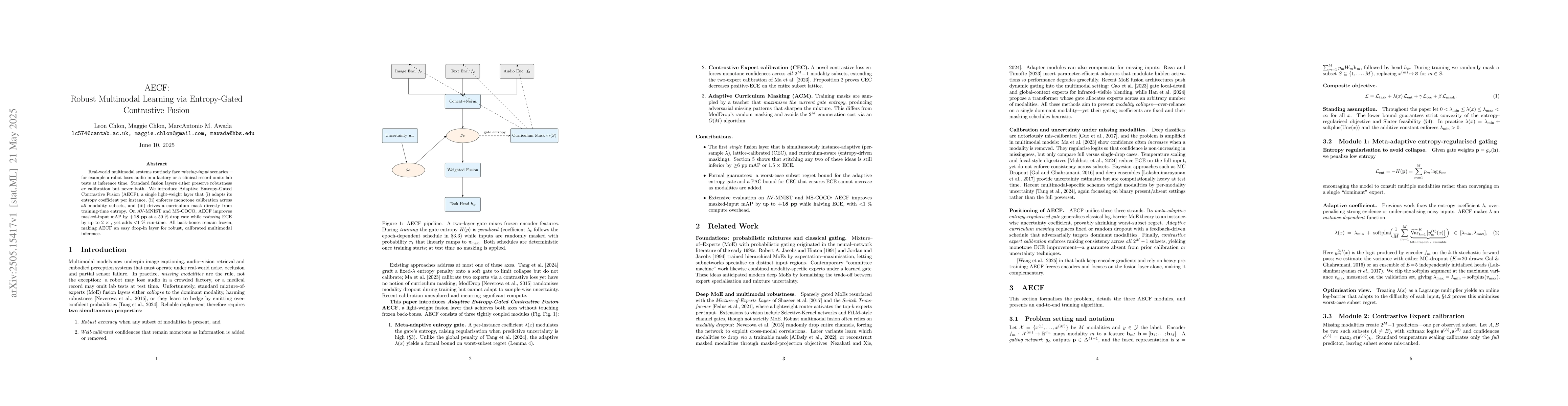The paper introduces Adaptive Entropy-Gated Contrastive Fusion (AECF), a lightweight layer that enhances robustness and calibration in multimodal systems dealing with missing inputs. AECF adapts entropy coefficients per instance, ensures monotone calibration, and learns masking directly from training entropy. On AV-MNIST and MS-COCO datasets, AECF improves masked-input mAP by 18 percentage points at a 50% input drop rate, while reducing ECE by up to 200%, with minimal computational overhead. It serves as an easy-to-implement layer for robust, calibrated multimodal inference, without requiring changes to the underlying model architecture.