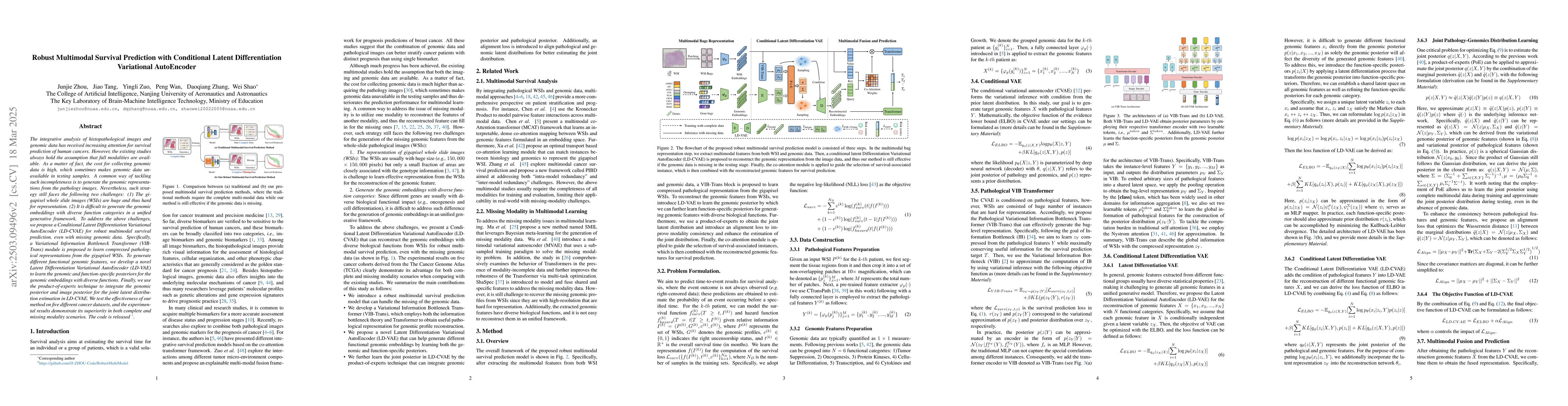 This paper proposes a Conditional Latent Differentiation Variational AutoEncoder (LD-CVAE) for robust multimodal survival prediction, addressing the challenges of incomplete genomic data and the complexity of gigapixel histopathological images. The method integrates a VIB-Trans module for compressed pathological representation and a LD-VAE for diverse genomic embeddings, showing superior performance across various cancer datasets.