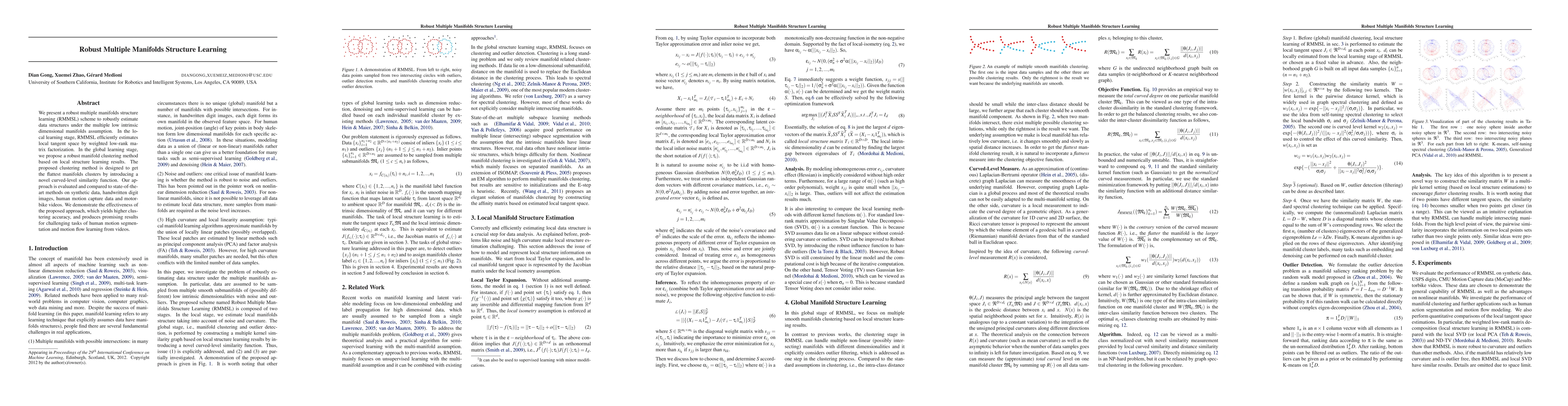 We present a robust multiple manifolds structure learning (RMMSL) scheme to robustly estimate data structures under the multiple low intrinsic dimensional manifolds assumption. In the local learning stage, RMMSL efficiently estimates local tangent space by weighted low-rank matrix factorization. In the global learning stage, we propose a robust manifold clustering method based on local structure learning results. The proposed clustering method is designed to get the flattest manifolds clusters by introducing a novel curved-level similarity function. Our approach is evaluated and compared to state-of-the-art methods on synthetic data, handwritten digit images, human motion capture data and motorbike videos. We demonstrate the effectiveness of the proposed approach, which yields higher clustering accuracy, and produces promising results for challenging tasks of human motion segmentation and motion flow learning from videos.