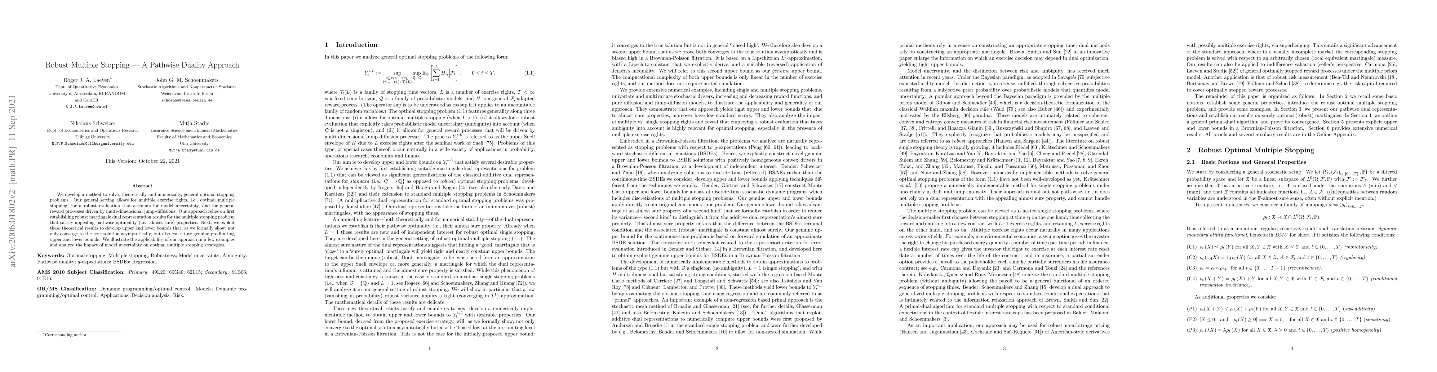 This paper develops a method to solve general optimal stopping problems with multiple exercise rights, accounting for model uncertainty and multi-dimensional jump-diffusions, providing asymptotically accurate pre-limiting bounds.
