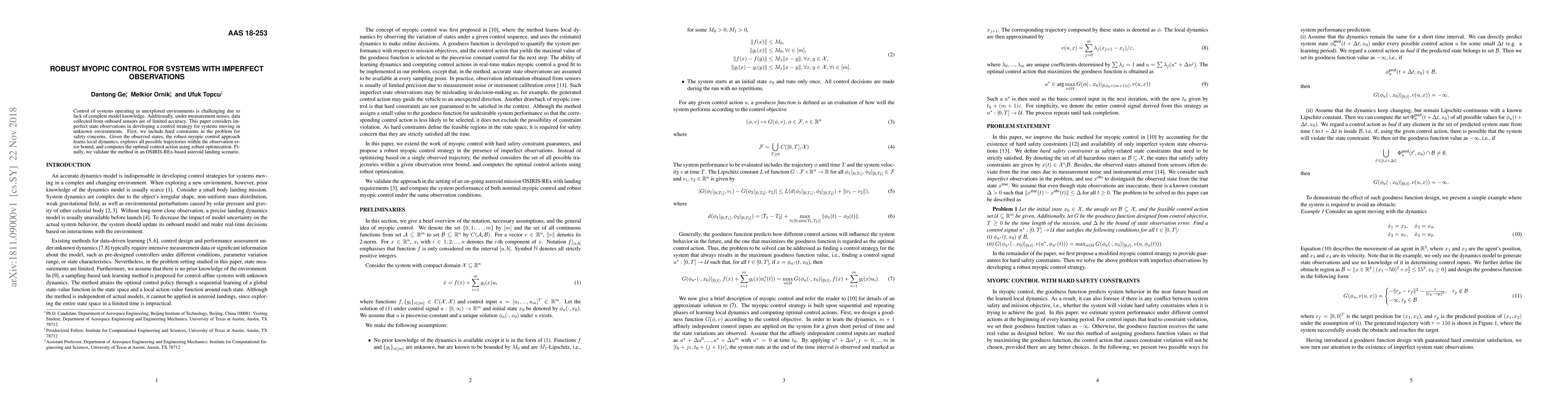 This paper develops a robust myopic control strategy for systems navigating unknown environments with imperfect observations, incorporating hard constraints for safety. The approach learns local dynamics, explores feasible trajectories, and computes optimal control actions using robust optimization, validated in an asteroid landing scenario.