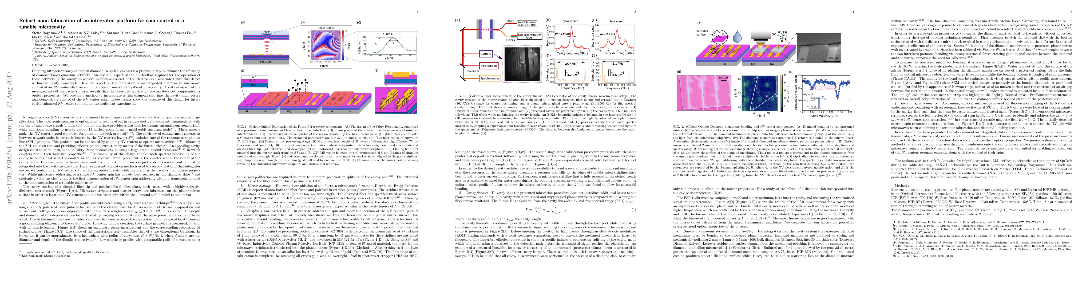 This paper details the fabrication of an integrated nano-platform for controlling the spin of nitrogen-vacancy centers in diamond using microwaves within a tunable microcavity. The method preserves the optical properties of the cavity, demonstrating potential for future quantum network applications.