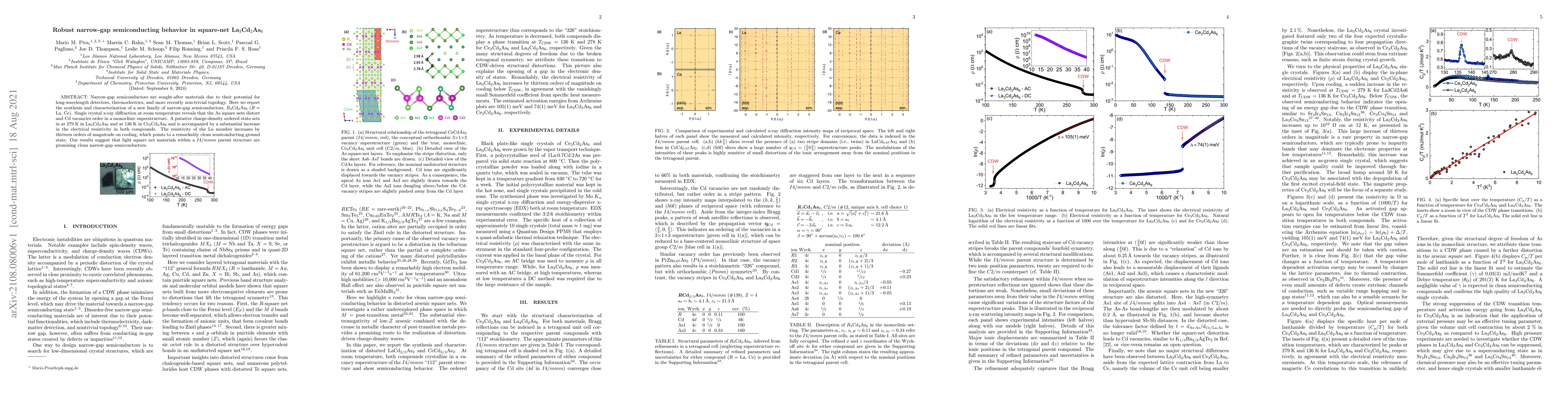 ABSTRACT: Narrow-gap semiconductors are sought-after materials due to their potential for long-wavelength detectors, thermoelectrics, and more recently non-trivial topology. Here we report the synthesis and characterization of a new family of narrow-gap semiconductors, $R$$_{3}$Cd$_{2}$As$_{6}$ ($R=$ La, Ce). Single crystal x-ray diffraction at room temperature reveals that the As square nets distort and Cd vacancies order in a monoclinic superstructure. A putative charge-density ordered state sets in at 279~K in La$_{3}$Cd$_{2}$As$_{6}$ and at 136~K in Ce$_{3}$Cd$_{2}$As$_{6}$ and is accompanied by a substantial increase in the electrical resistivity in both compounds. The resistivity of the La member increases by thirteen orders of magnitude on cooling, which points to a remarkably clean semiconducting ground state. Our results suggest that light square net materials within a $I4/mmm$ parent structure are promising clean narrow-gap semiconductors.