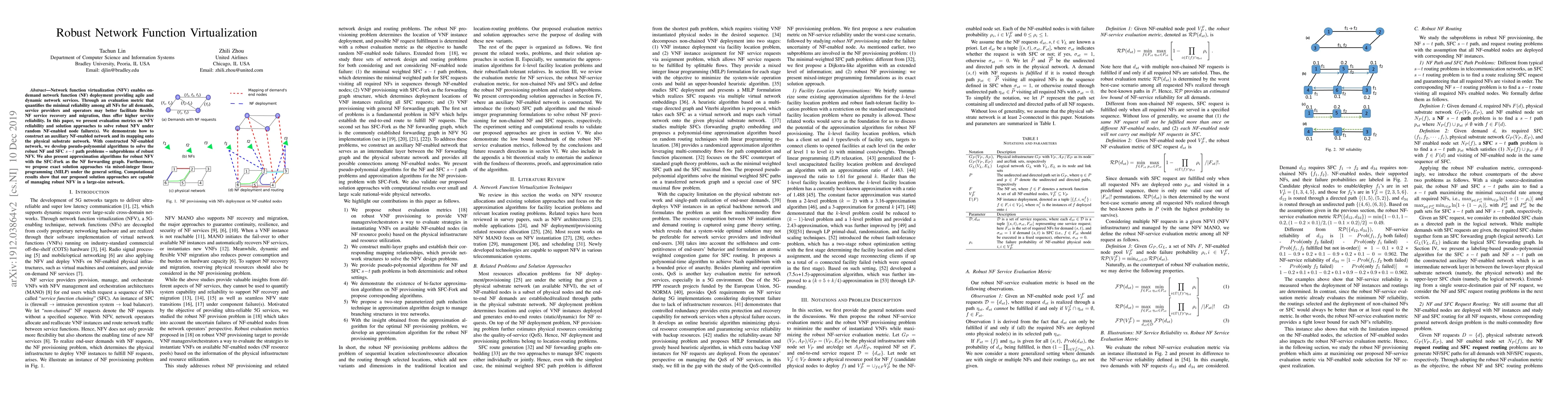 Network function virtualization (NFV) enables on-demand network function (NF) deployment providing agile and dynamic network services. Through an evaluation metric that quantifies the minimal reliability among all NFs for all demands, service providers and operators may better facilitate flexible NF service recovery and migration, thus offer higher service reliability. In this paper, we present evaluation metrics on NFV reliability and solution approaches to solve robust NFV under random NF-enabled node failure(s). We demonstrate how to construct an auxiliary NF-enabled network and its mapping onto the physical substrate network. With constructed NF-enabled network, we develop pseudo-polynomial algorithms to solve the robust NF and SFC $s-t$ path problems -- subproblems of robust NFV. We also present approximation algorithms for robust NFV with the SFC-Fork as the NF forwarding graph. Furthermore, we propose exact solution approaches via mixed-integer linear programming (MILP) under the general setting. Computational results show that our proposed solution approaches are capable of managing robust NFV in a large-size network.