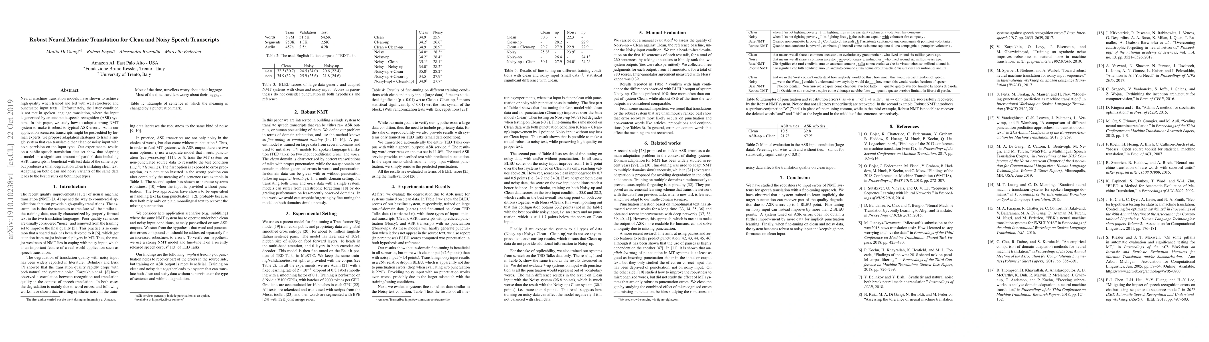 This paper explores adapting neural machine translation (NMT) systems to handle ASR errors in spoken language translation, proposing strategies to train a single robust model for both clean and noisy transcripts. Experimental results indicate that combining parallel data with both clean and noisy variants yields the best performance across both input types.