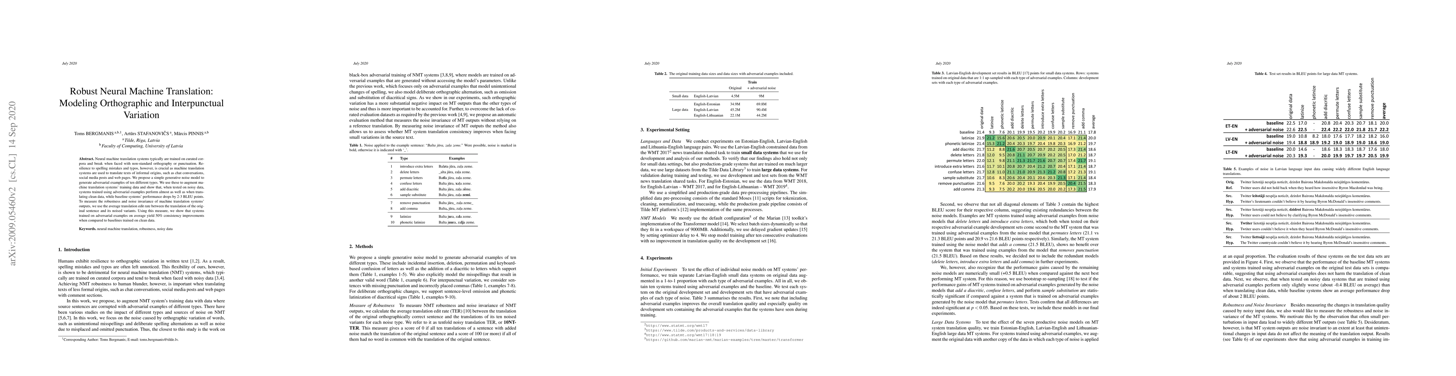 Neural machine translation systems typically are trained on curated corpora and break when faced with non-standard orthography or punctuation. Resilience to spelling mistakes and typos, however, is crucial as machine translation systems are used to translate texts of informal origins, such as chat conversations, social media posts and web pages. We propose a simple generative noise model to generate adversarial examples of ten different types. We use these to augment machine translation systems' training data and show that, when tested on noisy data, systems trained using adversarial examples perform almost as well as when translating clean data, while baseline systems' performance drops by 2-3 BLEU points. To measure the robustness and noise invariance of machine translation systems' outputs, we use the average translation edit rate between the translation of the original sentence and its noised variants. Using this measure, we show that systems trained on adversarial examples on average yield 50% consistency improvements when compared to baselines trained on clean data.