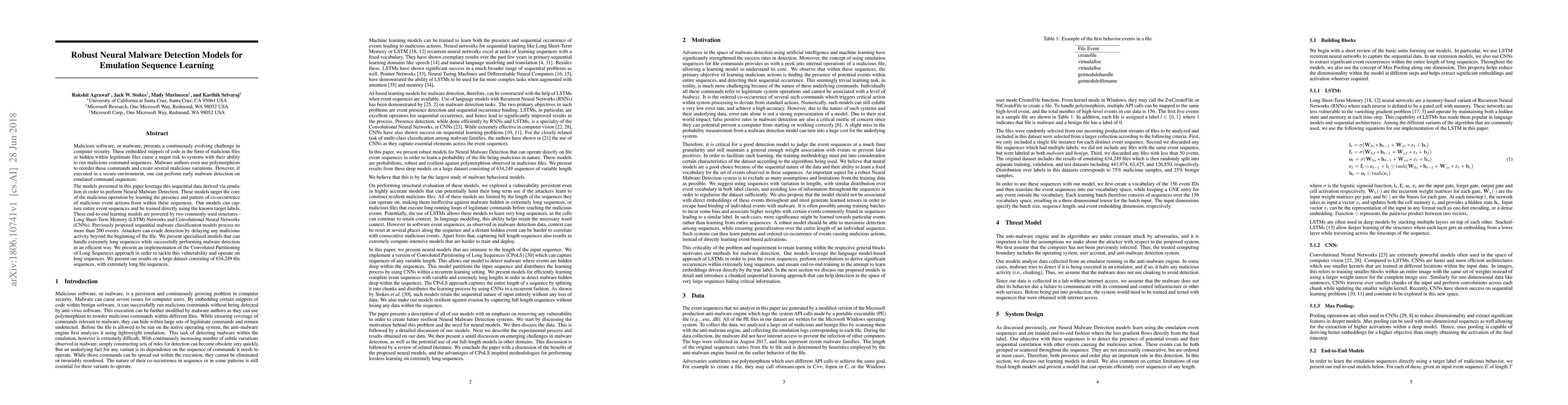 This paper proposes robust neural models for detecting malware through emulation of command sequences, utilizing LSTM and CNN architectures to handle long sequences effectively. The Convoluted Partitioning of Long Sequences approach enables the detection of malware even when malicious activities are delayed, achieving successful results on a large dataset of 634,249 file sequences.