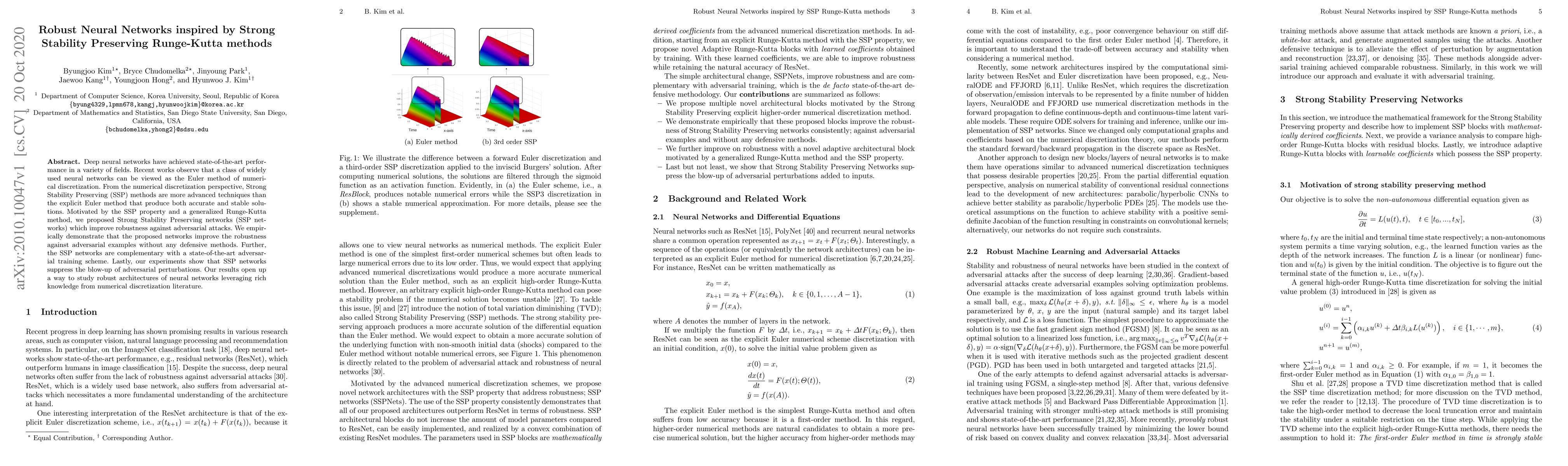 New neural networks inspired by Strong Stability Preserving Runge-Kutta methods improve robustness against adversarial attacks without needing defensive methods. These 'Strong Stability Preserving networks' offer a new way to study robust architectures of neural networks.