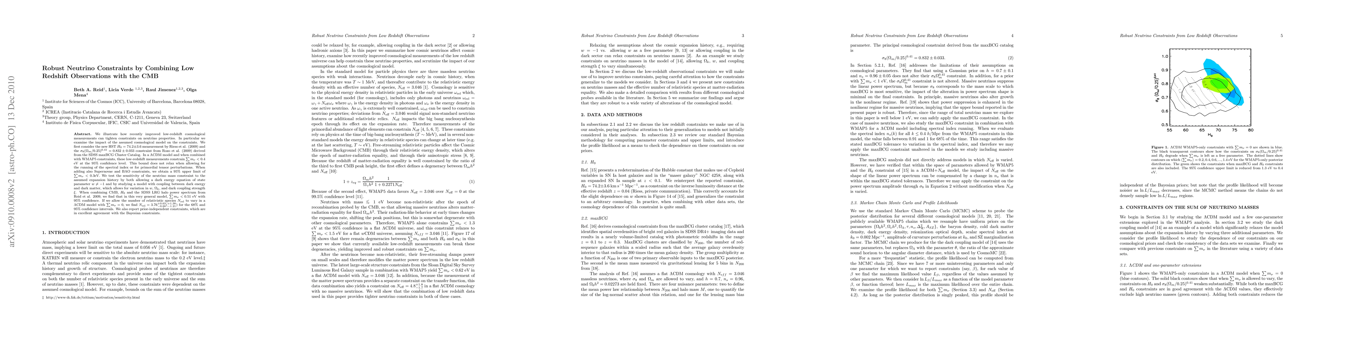 We illustrate how recently improved low-redshift cosmological measurements can tighten constraints on neutrino properties. In particular we examine the impact of the assumed cosmological model on the constraints. We first consider the new HST H0 = 74.2 +/- 3.6 measurement by Riess et al. (2009) and the sigma8*(Omegam/0.25)^0.41 = 0.832 +/- 0.033 constraint from Rozo et al. (2009) derived from the SDSS maxBCG Cluster Catalog. In a Lambda CDM model and when combined with WMAP5 constraints, these low-redshift measurements constrain sum mnu<0.4 eV at the 95% confidence level. This bound does not relax when allowing for the running of the spectral index or for primordial tensor perturbations. When adding also Supernovae and BAO constraints, we obtain a 95% upper limit of sum mnu<0.3 eV. We test the sensitivity of the neutrino mass constraint to the assumed expansion history by both allowing a dark energy equation of state parameter w to vary, and by studying a model with coupling between dark energy and dark matter, which allows for variation in w, Omegak, and dark coupling strength xi. When combining CMB, H0, and the SDSS LRG halo power spectrum from Reid et al. 2009, we find that in this very general model, sum mnu < 0.51 eV with 95% confidence. If we allow the number of relativistic species Nrel to vary in a Lambda CDM model with sum mnu = 0, we find Nrel = 3.76^{+0.63}_{-0.68} (^{+1.38}_{-1.21}) for the 68% and 95% confidence intervals. We also report prior-independent constraints, which are in excellent agreement with the Bayesian constraints.