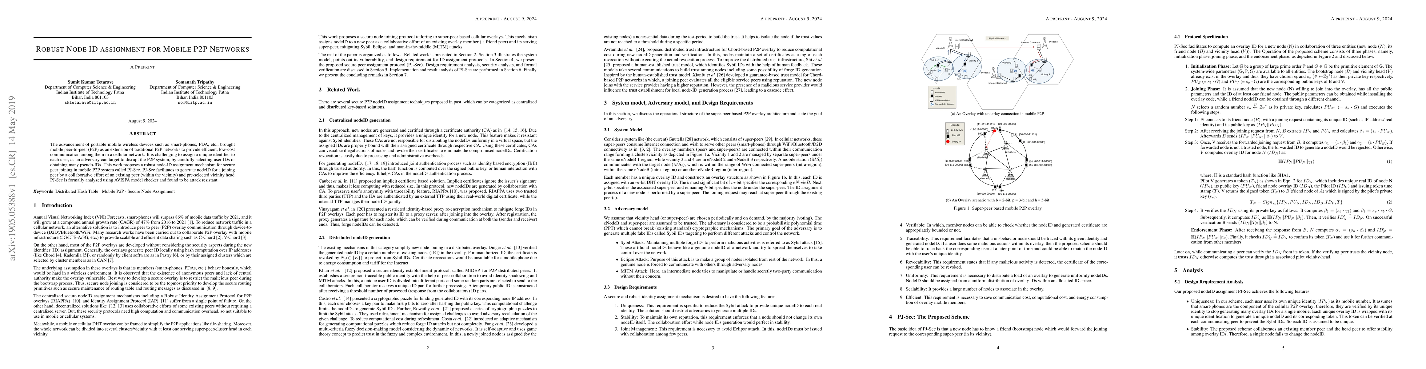 This paper proposes PJ-Sec, a robust mechanism for assigning secure unique identifiers to nodes in mobile peer-to-peer networks, leveraging collaborative efforts between existing peers and a pre-selected head to resist adversarial attacks. The method is formally verified using the AVISPA model checker for its attack resistance.