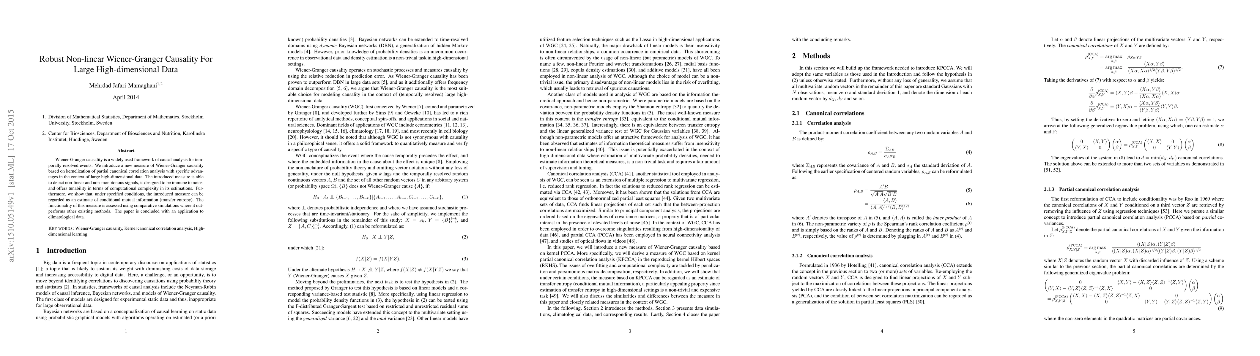 This paper introduces a new robust non-linear Wiener-Granger causality measure based on kernelized partial canonical correlation analysis for large high-dimensional data, demonstrating its ability to detect non-linear signals and noise immunity. It outperforms existing methods in simulations and is applied to climatological data.