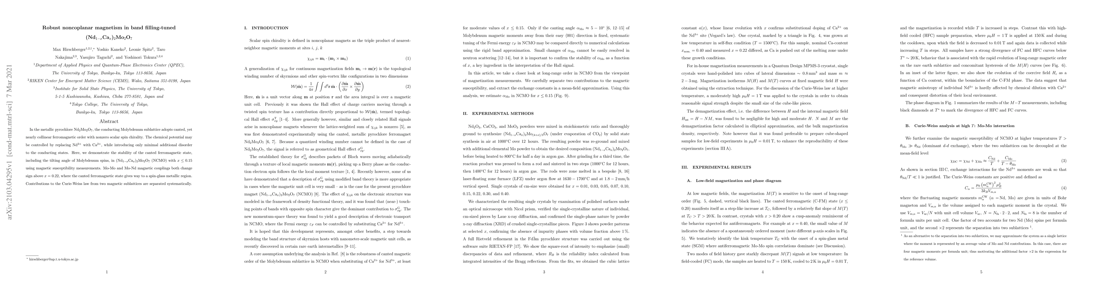 In the metallic pyrochlore Nd$_2$Mo$_2$O$_7$, the conducting Molybdenum sublattice adopts canted, yet nearly collinear ferromagnetic order with nonzero scalar spin chirality. The chemical potential may be controlled by replacing Nd$^{3+}$ with Ca$^{2+}$, while introducing only minimal additional disorder to the conducting states. Here, we demonstrate the stability of the canted ferromagnetic state, including the tilting angle of Molybdenum spins, in (Nd$_{1-x}$Ca$_{x}$)$_2$Mo$_2$O$_7$ (NCMO) with $x\le 0.15$ using magnetic susceptibility measurements. Mo-Mo and Mo-Nd magnetic couplings both change sign above $x=0.22$, where the canted ferromagnetic state gives way to a spin-glass metallic region. Contributions to the Curie-Weiss law from two magnetic sublattices are separated systematically.