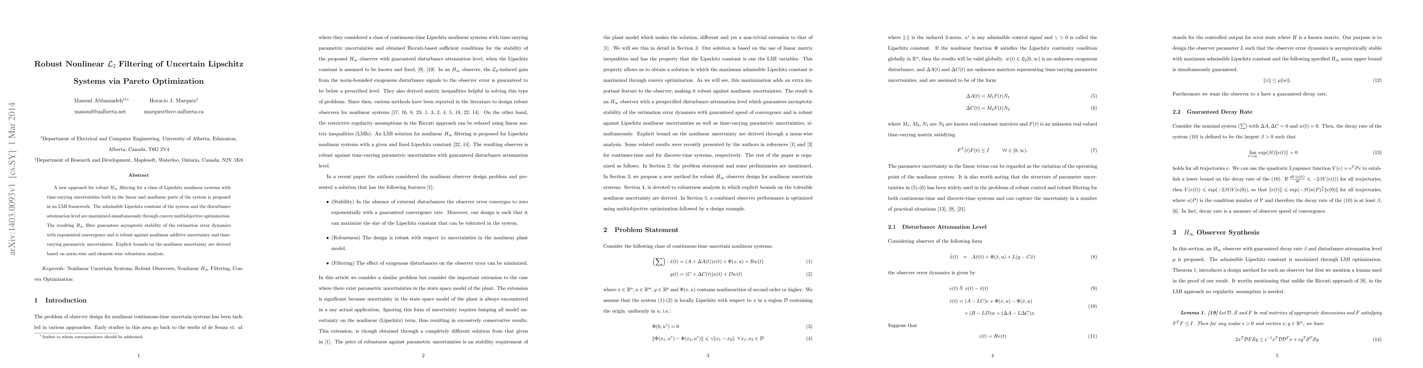This paper proposes a robust H∞ filtering method for Lipschitz nonlinear systems with time-varying uncertainties using Pareto optimization within an LMI framework. The method maximizes the Lipschitz constant and disturbance attenuation while ensuring asymptotic stability and exponential convergence of the estimation error.