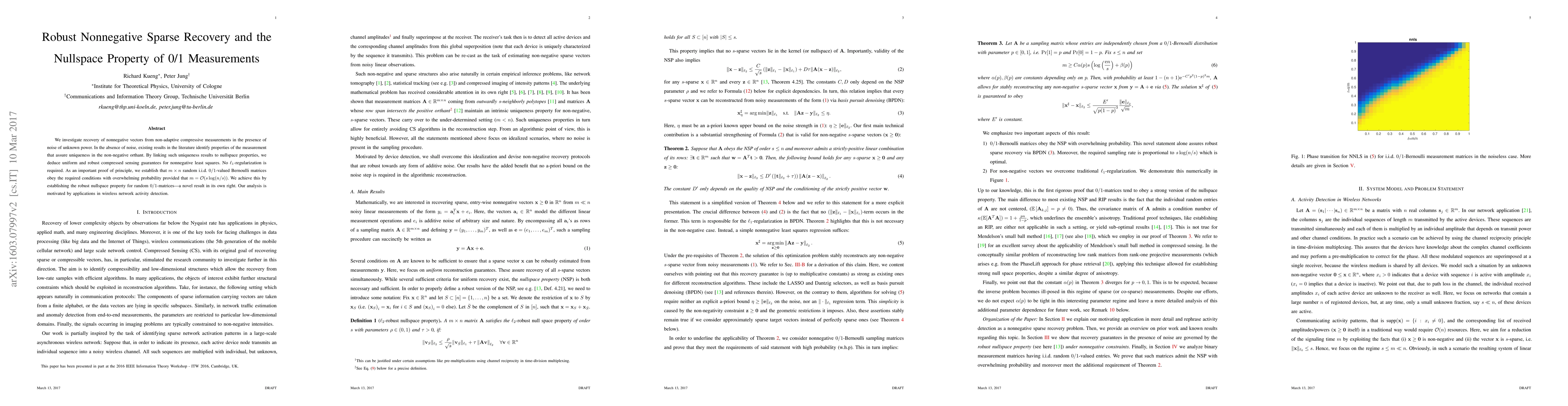 This paper establishes a method for recovering nonnegative sparse vectors from noisy compressive measurements without l1-regularization. It proves that random 0/1 matrices obey the required conditions with high probability, providing uniform and robust compressed sensing guarantees.