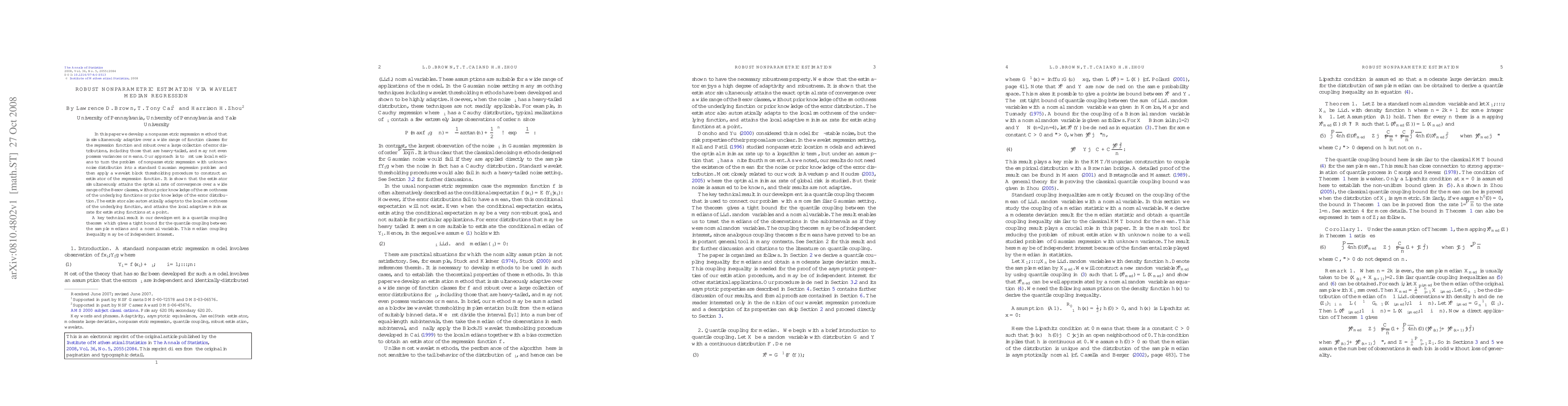 This paper proposes a robust nonparametric regression method using wavelet median regression, which adapts to various function classes and error distributions, including heavy-tailed errors. The method leverages local medians and wavelet block thresholding to achieve optimal convergence rates and local adaptive minimax estimation.