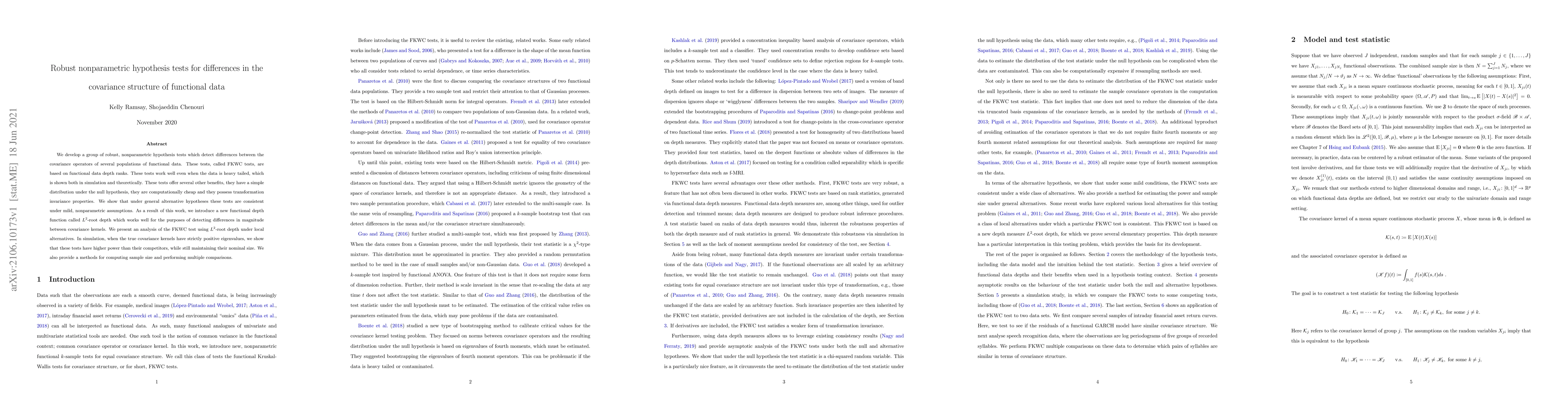 This paper develops robust, nonparametric FKWC hypothesis tests for detecting differences in the covariance structure of functional data, based on functional data depth ranks. These tests are effective for heavy-tailed data, computationally efficient, and consistent under mild assumptions, introducing a new L2-root depth function for better covariance kernel comparison.