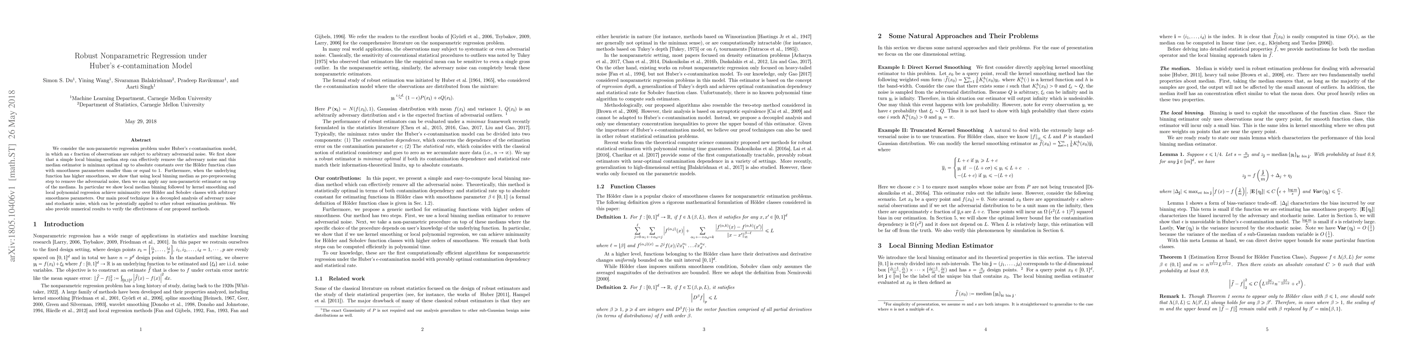 This paper proposes a robust nonparametric regression method under Huber's $\epsilon$-contamination model, where a fraction of observations are contaminated with adversarial noise. The method uses local binning median to effectively remove noise and achieve minimax optimality for various function classes, and it demonstrates the effectiveness of combining this preprocessing with kernel smoothing or local polynomial regression for higher smoothness functions.