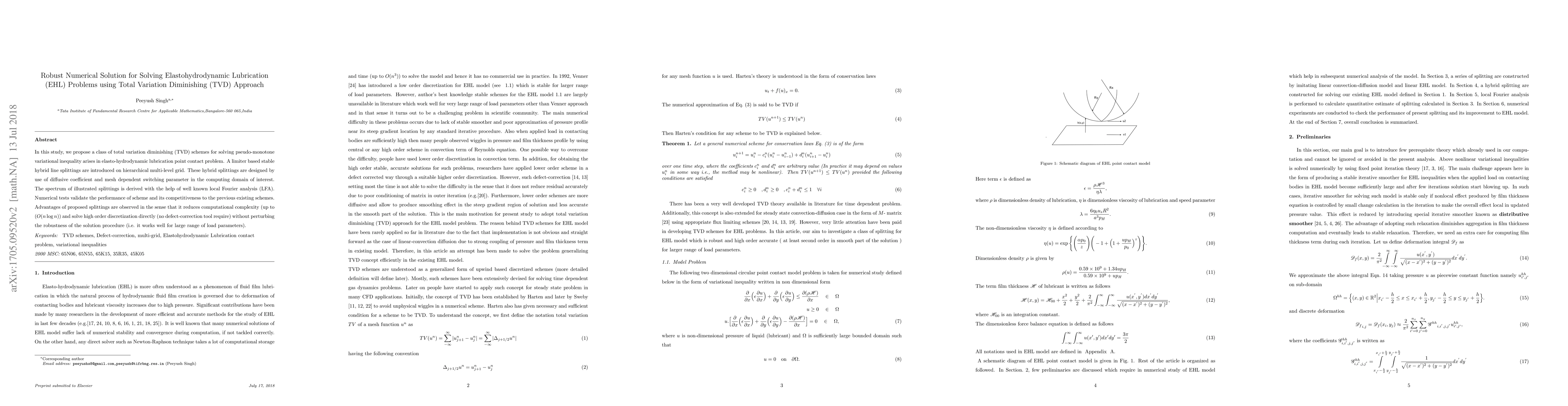 In this study, we propose a class of total variation diminishing (TVD) schemes for solving pseudo-monotone variational inequality arises in elasto-hydrodynamic lubrication point contact problem. A limiter based stable hybrid line splittings are introduced on hierarchical multi-level grid. These hybrid splittings are designed by use of diffusive coefficient and mesh dependent switching parameter in the computing domain of interest. The spectrum of illustrated splittings is derived with the help of well known local Fourier analysis (LFA). Numerical tests validate the performance of scheme and its competitiveness to the previous existing schemes. Advantages of proposed splittings are observed in the sense that it reduces computational complexity (up to ($O(n\log n)$) and solve high order discretization directly (no defect-correction tool require) without perturbing the robustness of the solution procedure (i.e. it works well for large range of load parameters).
