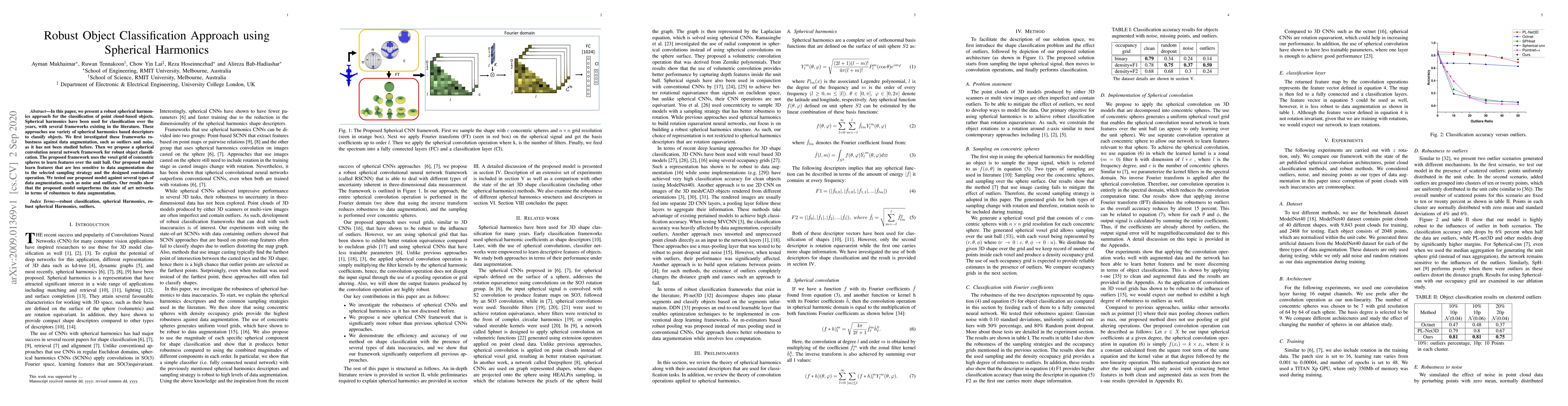 This paper introduces a robust spherical harmonics approach for classifying point cloud objects using a convolutional neural network framework. The proposed model, which employs a voxel grid of concentric spheres, demonstrates superior robustness to data augmentation compared to existing state-of-the-art networks.