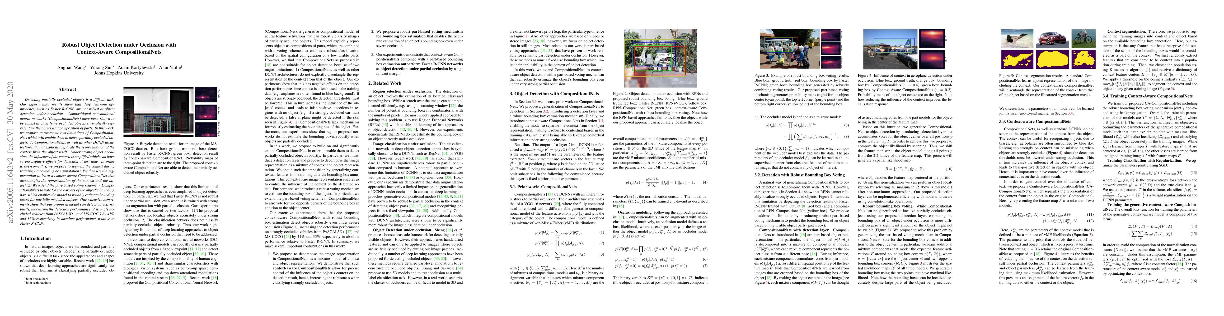 This research paper proposes a novel approach to improve the detection of partially occluded objects using CompositionalNets. The authors address two key limitations of existing models: the lack of explicit context separation and the part-based voting scheme. By segmenting the context during training and extending the voting scheme to object corners, the proposed context-aware CompositionalNets significantly enhance detection performance for occluded objects, achieving notable improvements over Faster R-CNN on PASCAL3D+ and MS-COCO datasets.