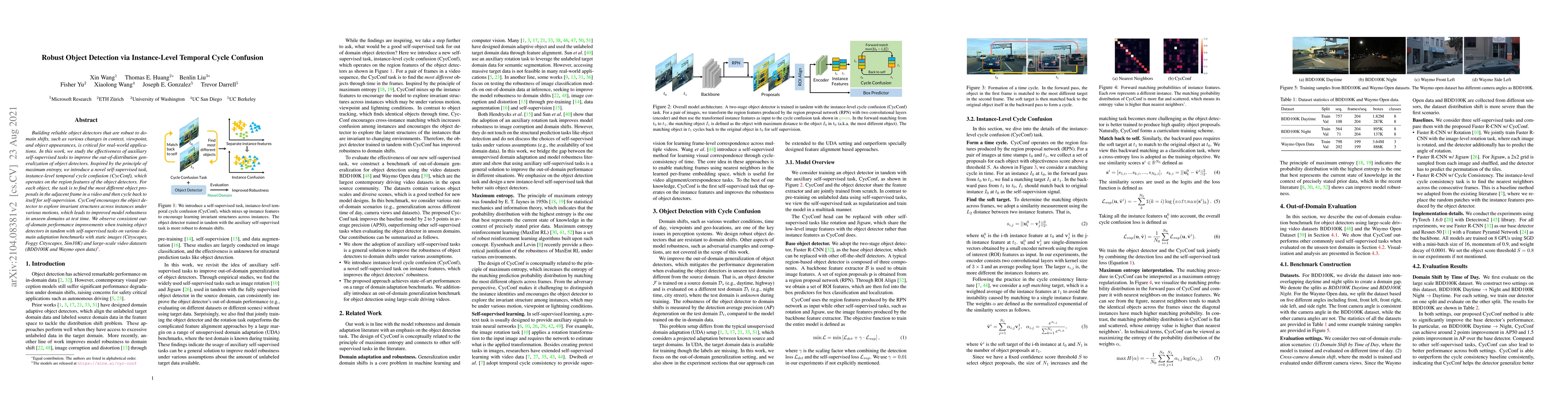 Building reliable object detectors that are robust to domain shifts, such as various changes in context, viewpoint, and object appearances, is critical for real-world applications. In this work, we study the effectiveness of auxiliary self-supervised tasks to improve the out-of-distribution generalization of object detectors. Inspired by the principle of maximum entropy, we introduce a novel self-supervised task, instance-level temporal cycle confusion (CycConf), which operates on the region features of the object detectors. For each object, the task is to find the most different object proposals in the adjacent frame in a video and then cycle back to itself for self-supervision. CycConf encourages the object detector to explore invariant structures across instances under various motions, which leads to improved model robustness in unseen domains at test time. We observe consistent out-of-domain performance improvements when training object detectors in tandem with self-supervised tasks on large-scale video datasets (BDD100K and Waymo open data). The joint training framework also establishes a new state-of-the-art on standard unsupervised domain adaptative detection benchmarks (Cityscapes, Foggy Cityscapes, and Sim10K). The code and models are available at https://github.com/xinw1012/cycle-confusion.