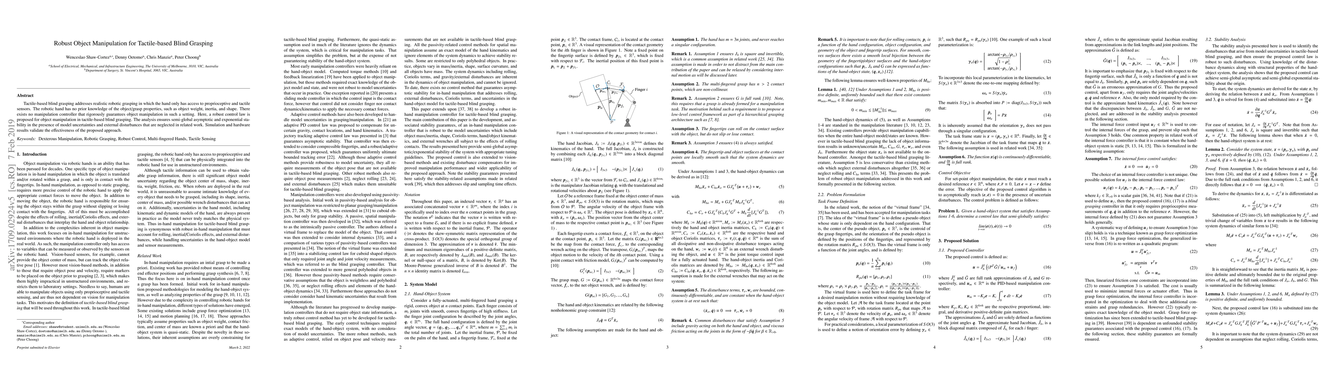 Tactile-based blind grasping addresses realistic robotic grasping in which the hand only has access to proprioceptive and tactile sensors. The robotic hand has no prior knowledge of the object/grasp properties, such as object weight, inertia, and shape. There exists no manipulation controller that rigorously guarantees object manipulation in such a setting. Here, a robust control law is proposed for object manipulation in tactile-based blind grasping. The analysis ensures semi-global asymptotic and exponential stability in the presence of model uncertainties and external disturbances that are neglected in related work. Simulation and experimental results validate the effectiveness of the proposed approach.