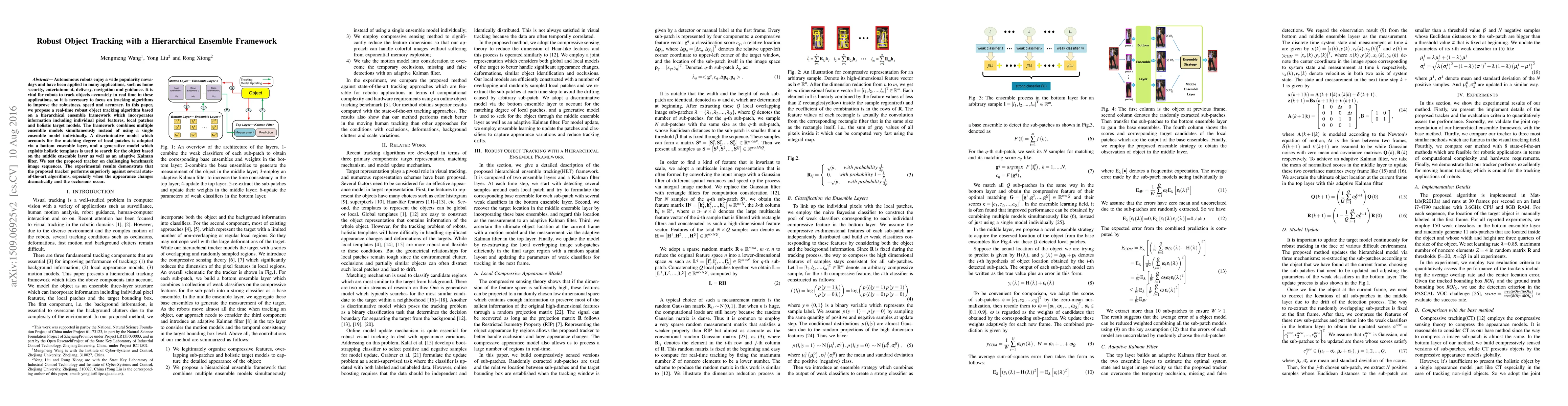 A novel object tracking algorithm is proposed using a hierarchical ensemble framework that combines multiple models to improve robustness and accuracy in challenging scenarios. The tracker outperforms state-of-the-art algorithms, particularly in situations with dramatic appearance changes and occlusions.