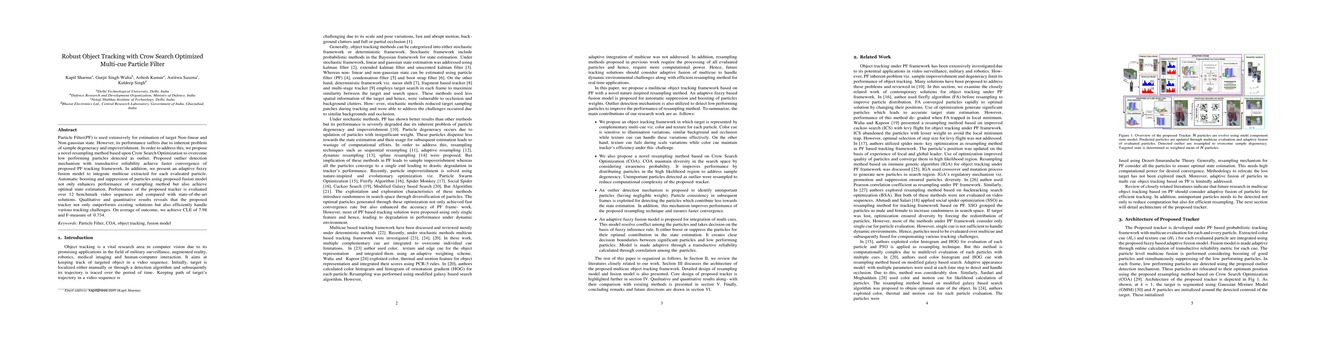 Particle Filter(PF) is used extensively for estimation of target Non-linear and Non-gaussian state. However, its performance suffers due to inherent problem of sample degeneracy and impoverishment. In order to address this, we propose a novel resampling method based upon Crow Search Optimization to overcome low performing particles detected as outlier. Proposed outlier detection mechanism with transductive reliability achieve faster convergence of proposed PF tracking framework. In addition, we present an adaptive fuzzy fusion model to integrate multi-cue extracted for each evaluated particle. Automatic boosting and suppression of particles using proposed fusion model not only enhances performance of resampling method but also achieve optimal state estimation. Performance of the proposed tracker is evaluated over 12 benchmark video sequences and compared with state-of-the-art solutions. Qualitative and quantitative results reveals that the proposed tracker not only outperforms existing solutions but also efficiently handle various tracking challenges. On average of outcome, we achieve CLE of 7.98 and F-measure of 0.734.