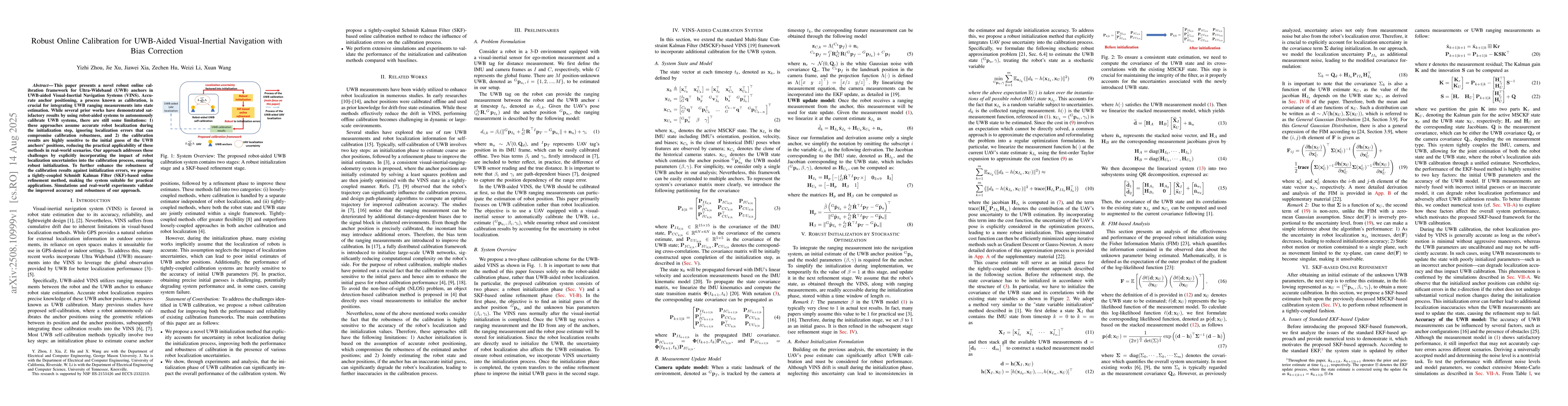 This paper presents a novel robust online calibration framework for Ultra-Wideband (UWB) anchors in UWB-aided Visual-Inertial Navigation Systems (VINS). Accurate anchor positioning, a process known as calibration, is crucial for integrating UWB ranging measurements into state estimation. While several prior works have demonstrated satisfactory results by using robot-aided systems to autonomously calibrate UWB systems, there are still some limitations: 1) these approaches assume accurate robot localization during the initialization step, ignoring localization errors that can compromise calibration robustness, and 2) the calibration results are highly sensitive to the initial guess of the UWB anchors' positions, reducing the practical applicability of these methods in real-world scenarios. Our approach addresses these challenges by explicitly incorporating the impact of robot localization uncertainties into the calibration process, ensuring robust initialization. To further enhance the robustness of the calibration results against initialization errors, we propose a tightly-coupled Schmidt Kalman Filter (SKF)-based online refinement method, making the system suitable for practical applications. Simulations and real-world experiments validate the improved accuracy and robustness of our approach.