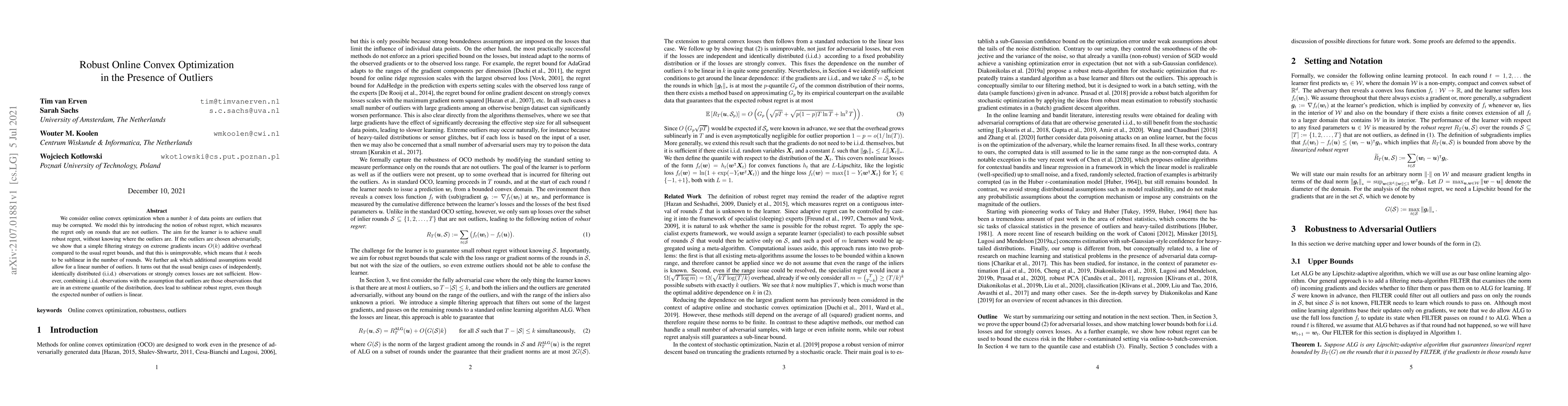 Researchers study online convex optimization with outliers, finding that filtering extreme gradients can add O(k) overhead and k needs to be sublinear. However, combining i.i.d. observations with outlier detection based on quantiles leads to sublinear robust regret.