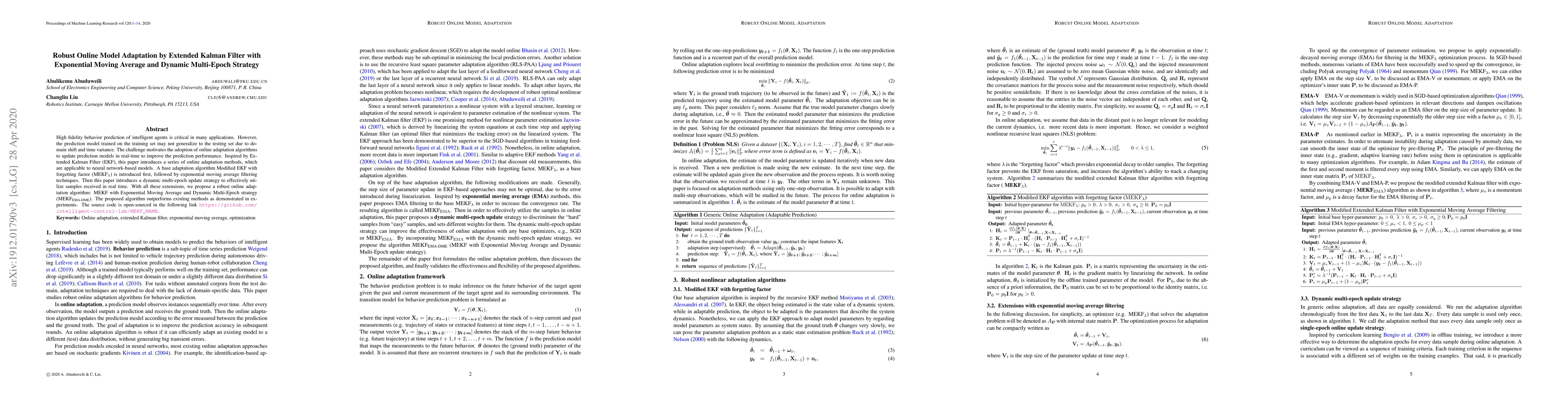 High fidelity behavior prediction of intelligent agents is critical in many applications. However, the prediction model trained on the training set may not generalize to the testing set due to domain shift and time variance. The challenge motivates the adoption of online adaptation algorithms to update prediction models in real-time to improve the prediction performance. Inspired by Extended Kalman Filter (EKF), this paper introduces a series of online adaptation methods, which are applicable to neural network-based models. A base adaptation algorithm Modified EKF with forgetting factor (MEKF$_\lambda$) is introduced first, followed by exponential moving average filtering techniques. Then this paper introduces a dynamic multi-epoch update strategy to effectively utilize samples received in real time. With all these extensions, we propose a robust online adaptation algorithm: MEKF with Exponential Moving Average and Dynamic Multi-Epoch strategy (MEKF$_{\text{EMA-DME}}$). The proposed algorithm outperforms existing methods as demonstrated in experiments. The source code is open-sourced in the following link https://github.com/intelligent-control-lab/MEKF_MAME.