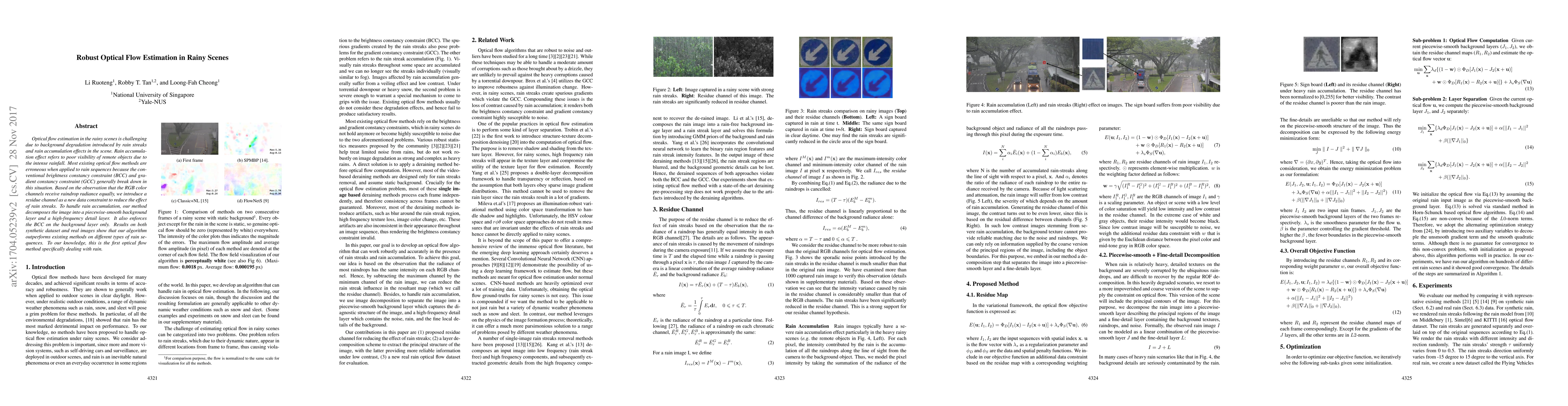 The paper proposes a robust optical flow estimation method in rainy scenes by introducing a residue channel and a piecewise-smooth + fine-detail decomposition scheme to handle rain streaks and rain accumulation effects.