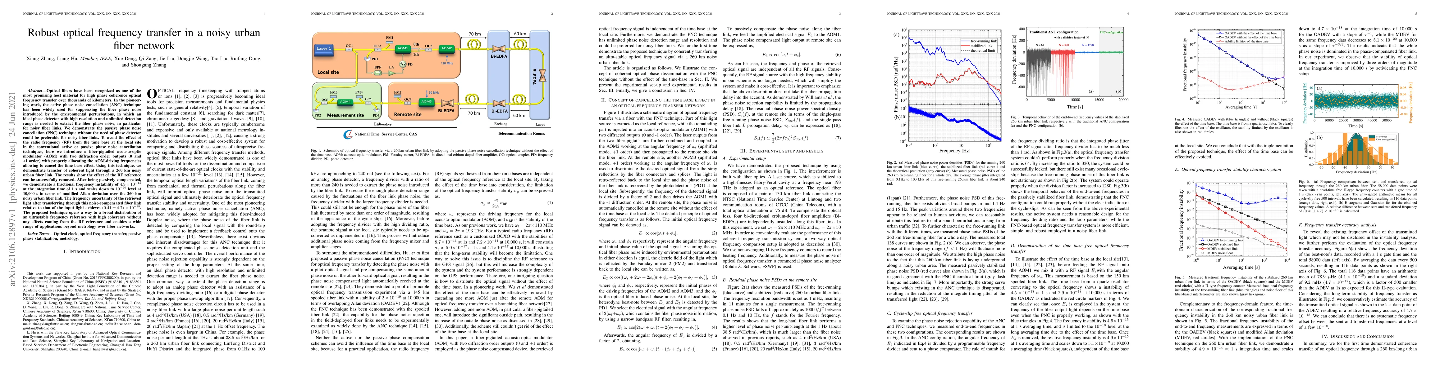 Optical fibers have been recognized as one of the most promising host material for high phase coherence optical frequency transfer over thousands of kilometers. In the pioneering work, the active phase noise cancellation (ANC) technique has been widely used for suppressing the fiber phase noise introduced by the environmental perturbations, in which an ideal phase detector with high resolution and unlimited detection range is needed to extract the fiber phase noise, in particular for noisy fiber links. We demonstrate the passive phase noise cancellation (PNC) technique without the need of phase detector could be preferable for noisy fiber links. To avoid the effect of the radio frequency (RF) from the time base at the local site in the conventional active or passive phase noise cancellation techniques, here we introduce a fiber-pigtailed acousto-optic modulator (AOM) with two diffraction order outputs (0 and +1 order) with properly allocating the AOM-driving frequencies allowing to cancel the time base effect. Using this technique, we demonstrate transfer of coherent light through a 260 km noisy urban fiber link. The results show the effect of the RF reference can be successfully removed. After being passively compensated, {we demonstrate a fractional frequency instability of $4.9\times10^{-14}$ at the integration time of 1 s and scales down to $10^{-20}$ level at 10,000 s in terms of modified Allan deviation over the 260 km noisy urban fiber link}. The frequency uncertainty of the retrieved light after transferring through this noise-compensated fiber link relative to that of the input light achieves $(0.41\pm4.7)\times10^{-18}$. The proposed technique opens a way to a broad distribution of an ultrastable frequency reference with high coherence without any effects coming from the RF reference and enables a wide range of applications beyond metrology over fiber networks.