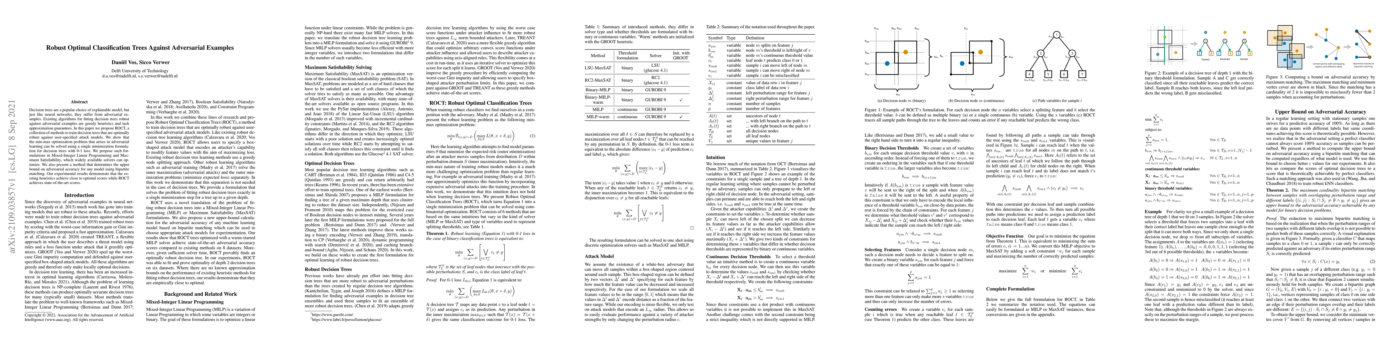 This paper introduces ROCT, a novel framework for training decision trees that are optimally robust against adversarial examples, employing Mixed-Integer Linear Programming and Maximum Satisfiability formulations. Experimental results show ROCT achieves state-of-the-art robustness compared to existing heuristics.