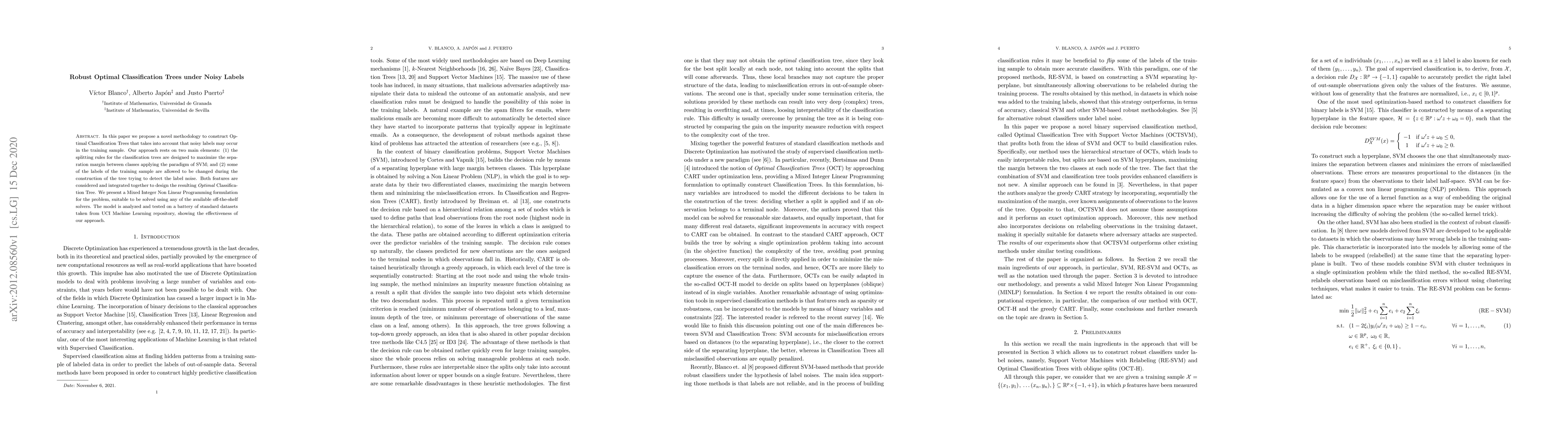 This paper introduces a robust methodology for constructing Optimal Classification Trees that can handle noisy labels in the training data. The approach maximizes class separation using SVM principles and allows label corrections during tree construction to detect noise, employing a Mixed Integer Non-Linear Programming formulation for implementation.
