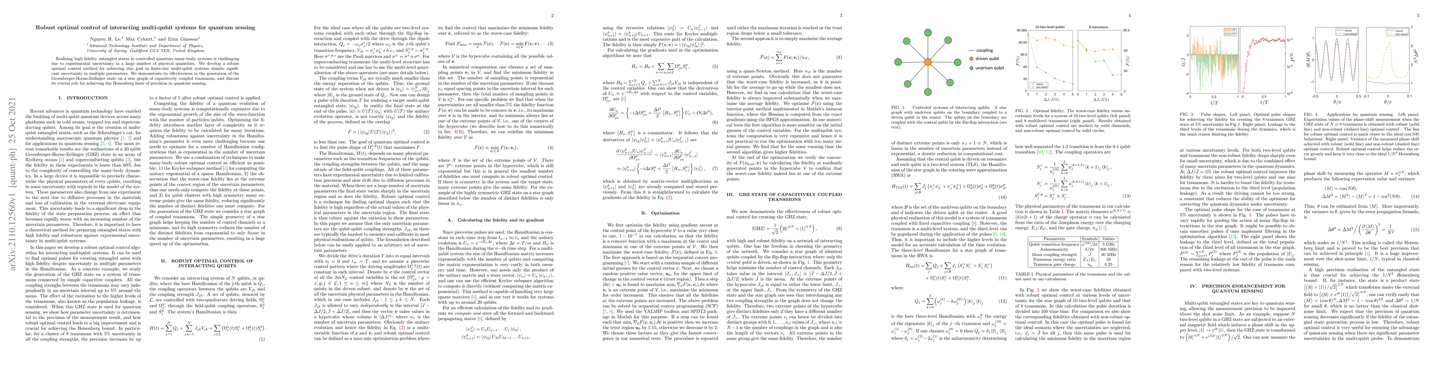 This paper presents a robust optimal control method for generating high fidelity entangled states in multi-qubit systems despite experimental uncertainties. The method is demonstrated to effectively create the Greenberger-Horne-Zeilinger state on a star graph of capacitively coupled transmons, crucial for reaching the Heisenberg limit in quantum sensing.