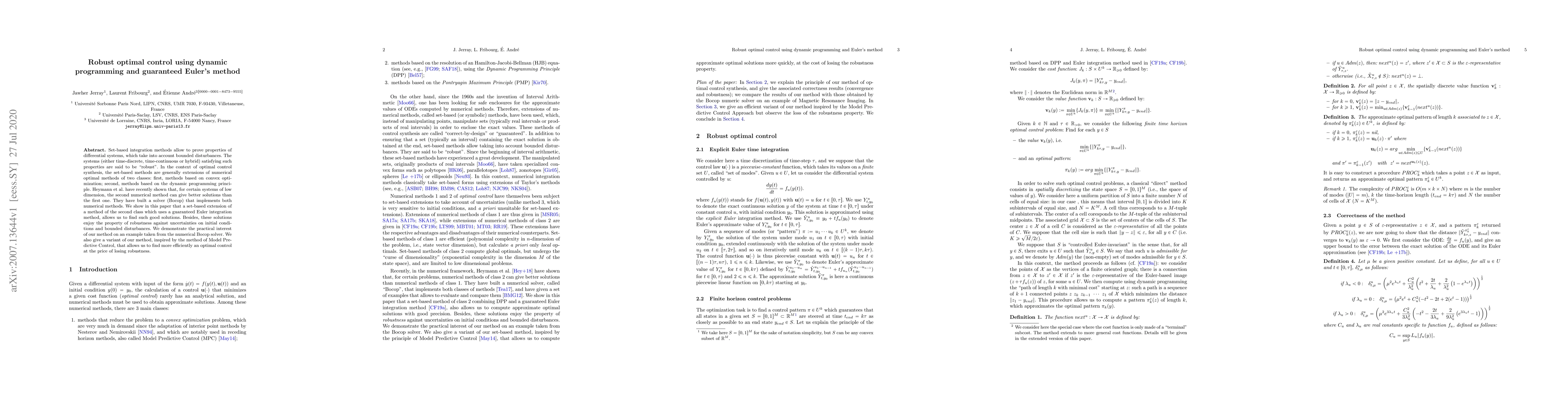 Set-based integration methods allow to prove properties of differential systems, which take into account bounded disturbances. The systems (either time-discrete, time-continuous or hybrid) satisfying such properties are said to be "robust". In the context of optimal control synthesis, the set-based methods are generally extensions of numerical optimal methods of two classes: first, methods based on convex optimization; second, methods based on the dynamic programming principle. Heymann et al. have recently shown that, for certain systems of low dimension, the second numerical method can give better solutions than the first one. They have built a solver (Bocop) that implements both numerical methods. We show in this paper that a set-based extension of a method of the second class which uses a guaranteed Euler integration method, allows us to find such good solutions. Besides, these solutions enjoy the property of robustness against uncertainties on initial conditions and bounded disturbances. We demonstrate the practical interest of our method on an example taken from the numerical Bocop solver. We also give a variant of our method, inspired by the method of Model Predictive Control, that allows us to find more efficiently an optimal control at the price of losing robustness.