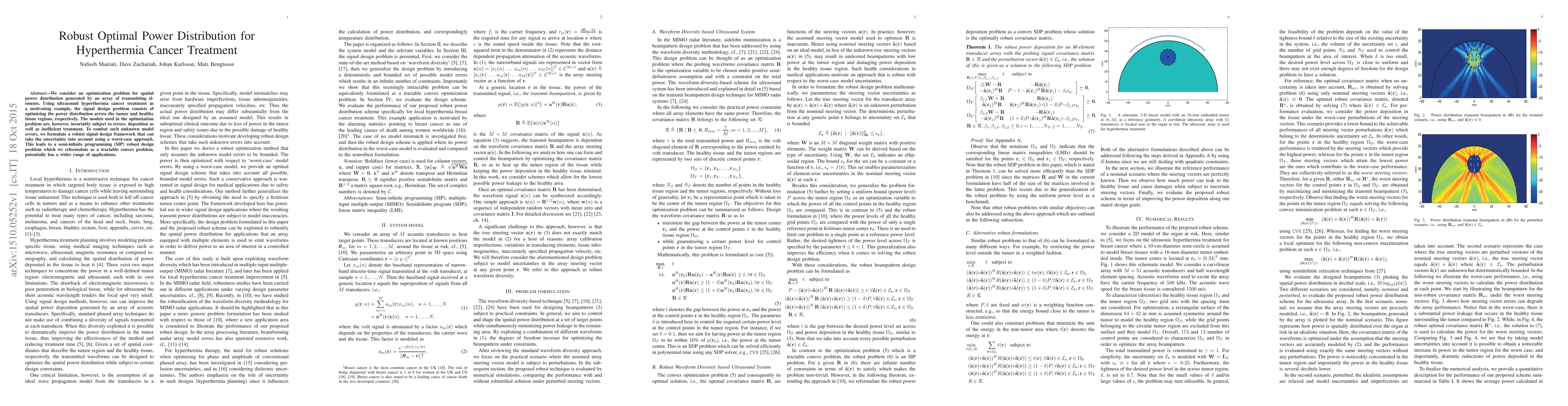 We consider an optimization problem for spatial power distribution generated by an array of transmitting elements. Using ultrasound hyperthermia cancer treatment as a motivating example, the signal design problem consists of optimizing the power distribution across the tumor and healthy tissue regions, respectively. The models used in the optimization problem are, however, invariably subject to errors. deposition as well as inefficient treatment. To combat such unknown model errors, we formulate a robust signal design framework that can take the uncertainty into account using a worst-case approach. This leads to a semi-infinite programming (SIP) robust design problem which we reformulate as a tractable convex problem, potentially has a wider range of applications.