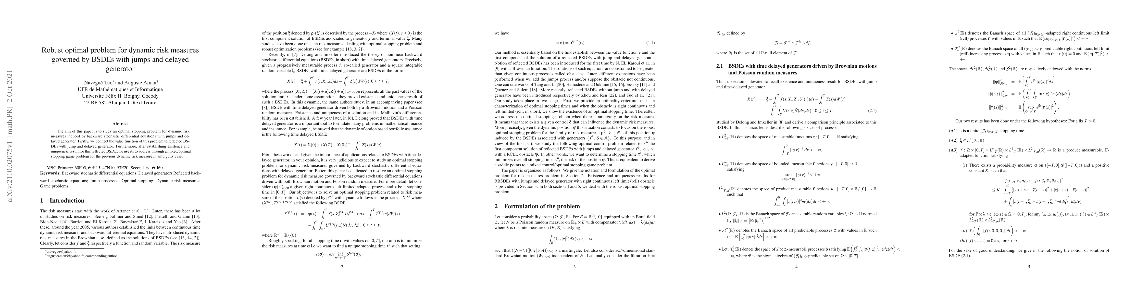 This paper investigates an optimal stopping problem for dynamic risk measures derived from backward stochastic differential equations (BSDEs) with jumps and a delayed generator. It links the value function to reflected BSDEs with similar characteristics and uses the reflected BSDE to solve an optimal stopping game problem for the dynamic risk measure under ambiguity.