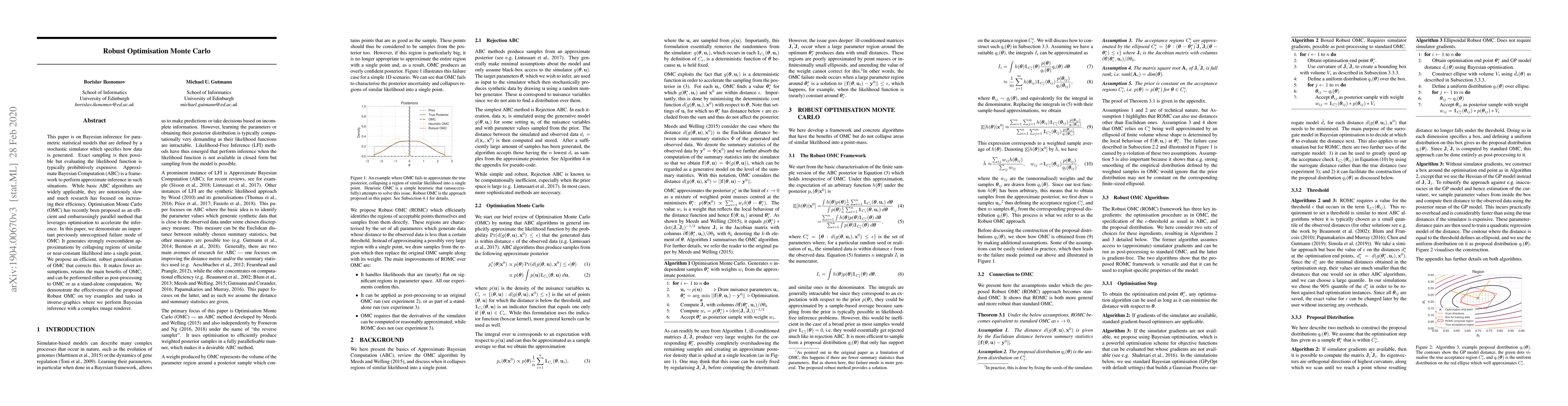 This paper is on Bayesian inference for parametric statistical models that are defined by a stochastic simulator which specifies how data is generated. Exact sampling is then possible but evaluating the likelihood function is typically prohibitively expensive. Approximate Bayesian Computation (ABC) is a framework to perform approximate inference in such situations. While basic ABC algorithms are widely applicable, they are notoriously slow and much research has focused on increasing their efficiency. Optimisation Monte Carlo (OMC) has recently been proposed as an efficient and embarrassingly parallel method that leverages optimisation to accelerate the inference. In this paper, we demonstrate an important previously unrecognised failure mode of OMC: It generates strongly overconfident approximations by collapsing regions of similar or near-constant likelihood into a single point. We propose an efficient, robust generalisation of OMC that corrects this. It makes fewer assumptions, retains the main benefits of OMC, and can be performed either as post-processing to OMC or as a stand-alone computation. We demonstrate the effectiveness of the proposed Robust OMC on toy examples and tasks in inverse-graphics where we perform Bayesian inference with a complex image renderer.