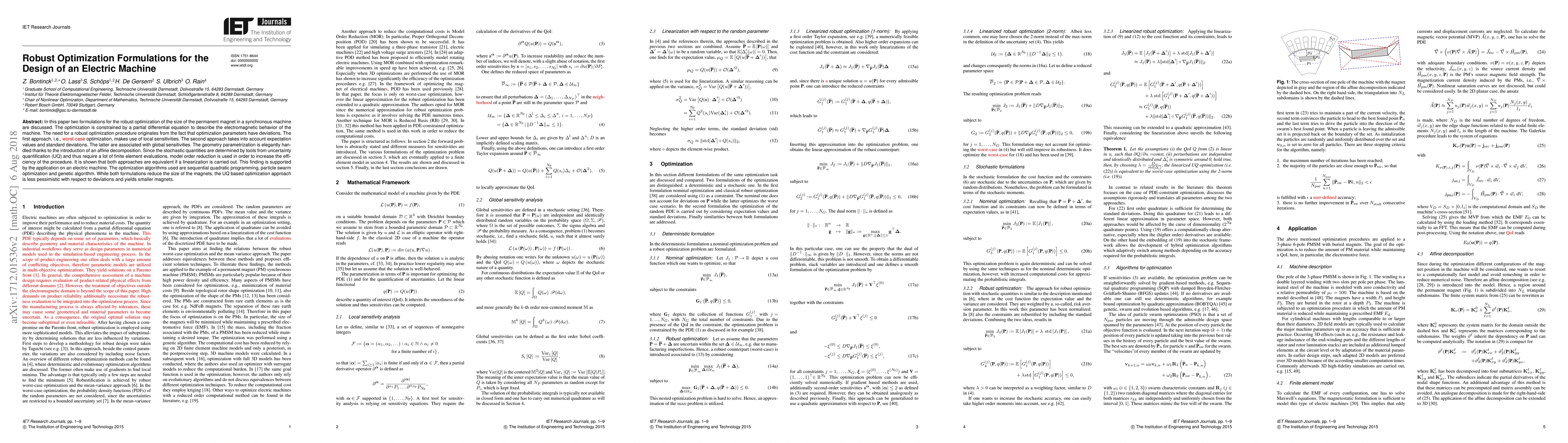 In this paper two formulations for the robust optimization of the size of the permanent magnet in a synchronous machine are discussed. The optimization is constrained by a partial differential equation to describe the electromagnetic behavior of the machine. The need for a robust optimization procedure originates from the fact that optimization parameters have deviations. The first approach, i.e., \textcolor{red}{worst-case} optimization, makes use of local sensitivities. The second approach takes into account expectation values and standard deviations. The latter are associated with global sensitivities. The geometry parametrization is elegantly handled thanks to the introduction of an affine decomposition. Since the stochastic quantities are determined by tools from uncertainty quantification (UQ) and thus require a lot of finite element evaluations, model order reduction is used in order to increase the efficiency of the procedure. It is shown that both approaches are equivalent if a linearization is carried out. \textcolor{blue}{This finding is supported by the application on an electric machine. The optimization algorithms used are sequential quadratic programming, particle swarm optimization and genetic algorithm}. While both formulations reduce the size of the magnets, the UQ based optimization approach is less pessimistic with respect to deviations and yields smaller magnets.