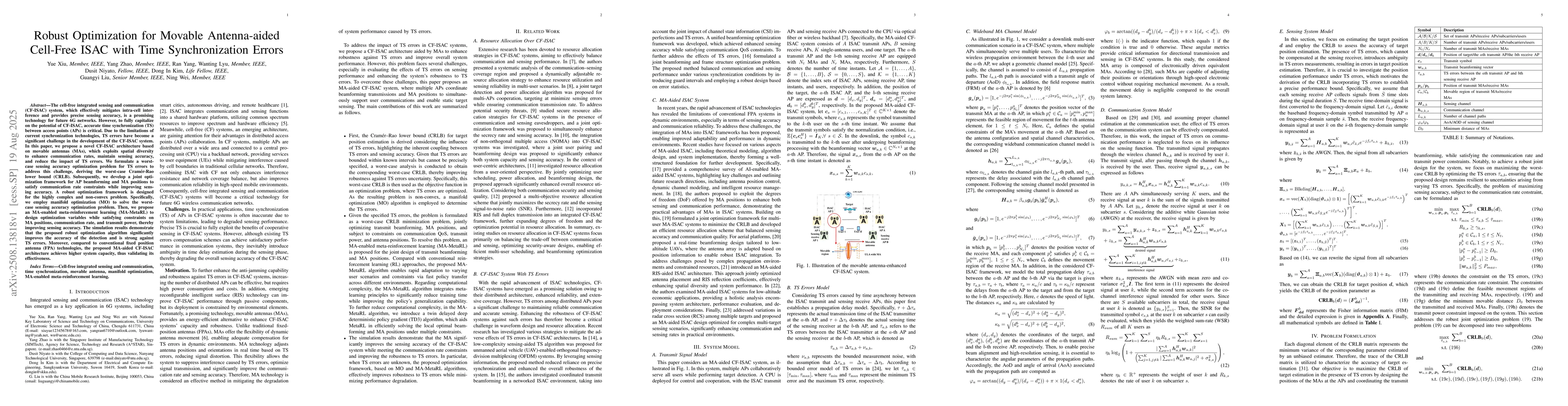 The cell-free integrated sensing and communication (CF-ISAC) system, which effectively mitigates intra-cell interference and provides precise sensing accuracy, is a promising technology for future 6G networks. However, to fully capitalize on the potential of CF-ISAC, accurate time synchronization (TS) between access points (APs) is critical. Due to the limitations of current synchronization technologies, TS errors have become a significant challenge in the development of the CF-ISAC system. In this paper, we propose a novel CF-ISAC architecture based on movable antennas (MAs), which exploits spatial diversity to enhance communication rates, maintain sensing accuracy, and reduce the impact of TS errors. We formulate a worst-case sensing accuracy optimization problem for TS errors to address this challenge, deriving the worst-case Cram\'er-Rao lower bound (CRLB). Subsequently, we develop a joint optimization framework for AP beamforming and MA positions to satisfy communication rate constraints while improving sensing accuracy. A robust optimization framework is designed for the highly complex and non-convex problem. Specifically, we employ manifold optimization (MO) to solve the worst-case sensing accuracy optimization problem. Then, we propose an MA-enabled meta-reinforcement learning (MA-MetaRL) to design optimization variables while satisfying constraints on MA positions, communication rate, and transmit power, thereby improving sensing accuracy. The simulation results demonstrate that the proposed robust optimization algorithm significantly improves the accuracy of the detection and is strong against TS errors. Moreover, compared to conventional fixed position antenna (FPA) technologies, the proposed MA-aided CF-ISAC architecture achieves higher system capacity, thus validating its effectiveness.