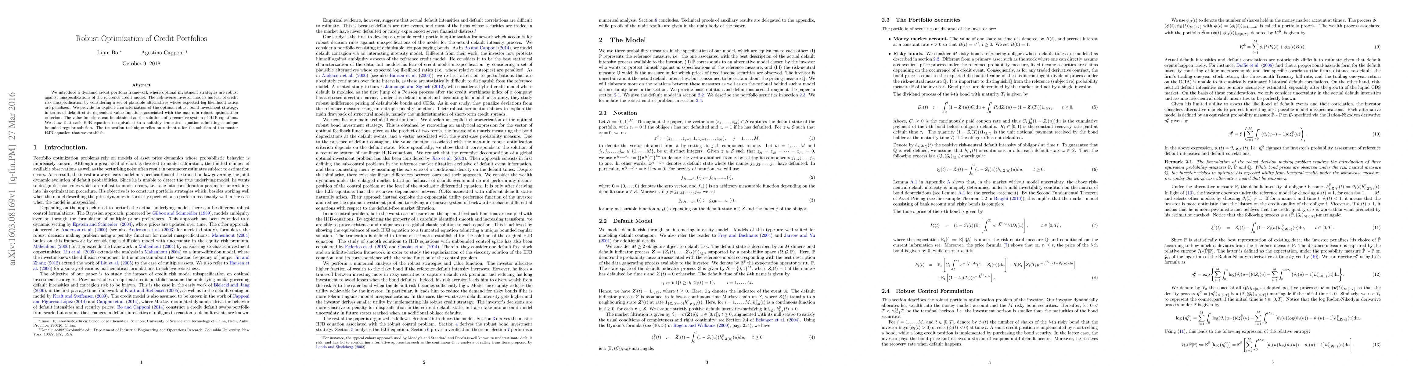 We introduce a dynamic credit portfolio framework where optimal investment strategies are robust against misspecifications of the reference credit model. The risk-averse investor models his fear of credit risk misspecification by considering a set of plausible alternatives whose expected log likelihood ratios are penalized. We provide an explicit characterization of the optimal robust bond investment strategy, in terms of default state dependent value functions associated with the max-min robust optimization criterion. The value functions can be obtained as the solutions of a recursive system of HJB equations. We show that each HJB equation is equivalent to a suitably truncated equation admitting a unique bounded regular solution. The truncation technique relies on estimates for the solution of the master HJB equation that we establish.
